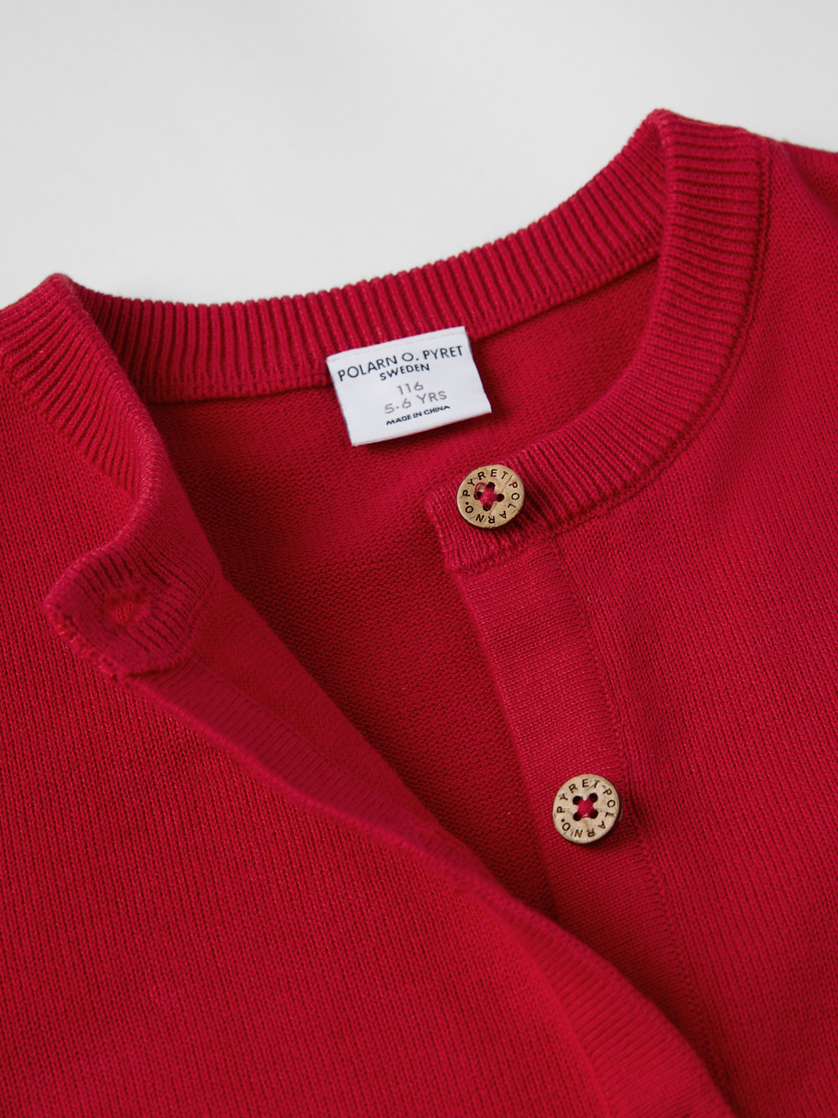 Finstrikket cardigan i myk økologisk bomull – et av sesongens “må ha”-plagg! Cardiganen lukkes med knappestolpe foran. Ribbestrikkede mansjetter ved hals, ermer og nederkant gir en god passform.