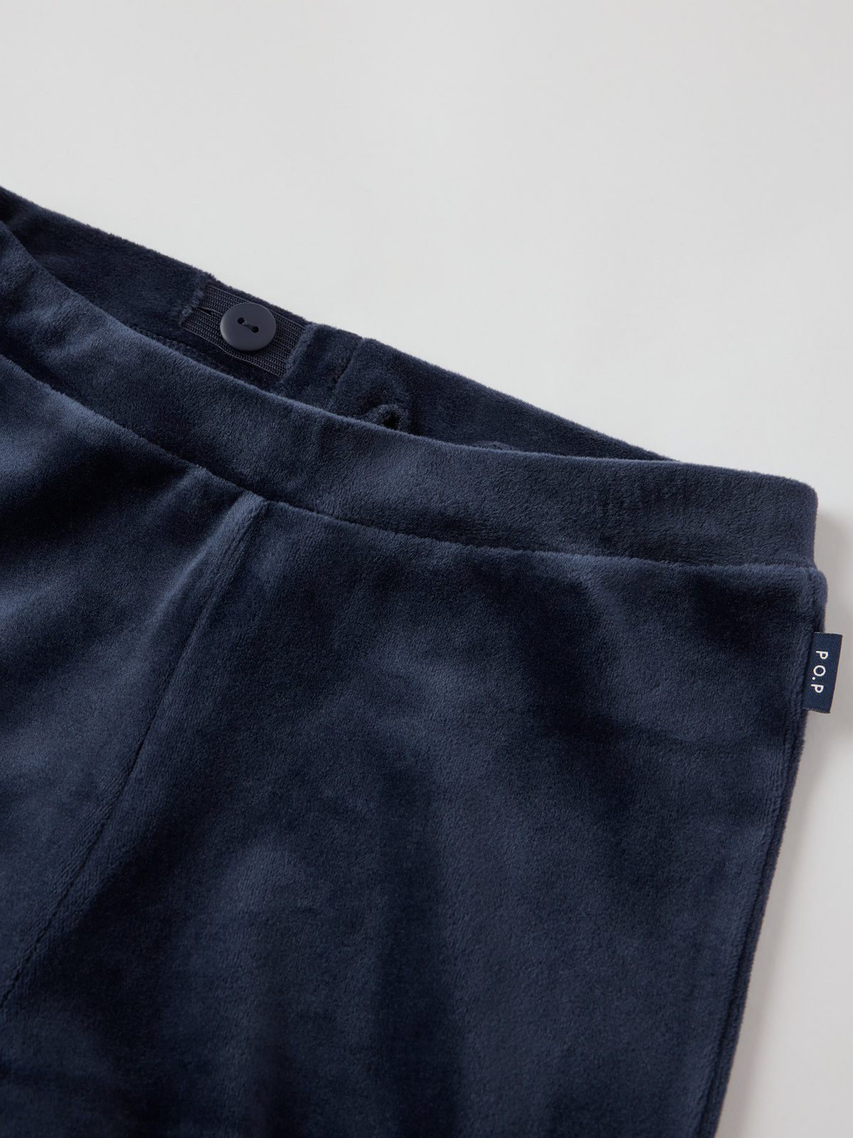 Bukse i myk velour laget av resirkulert polyester – en skikkelig høstfavoritt! Buksen har rette ben og justerbar midje med knapphullstrikk.