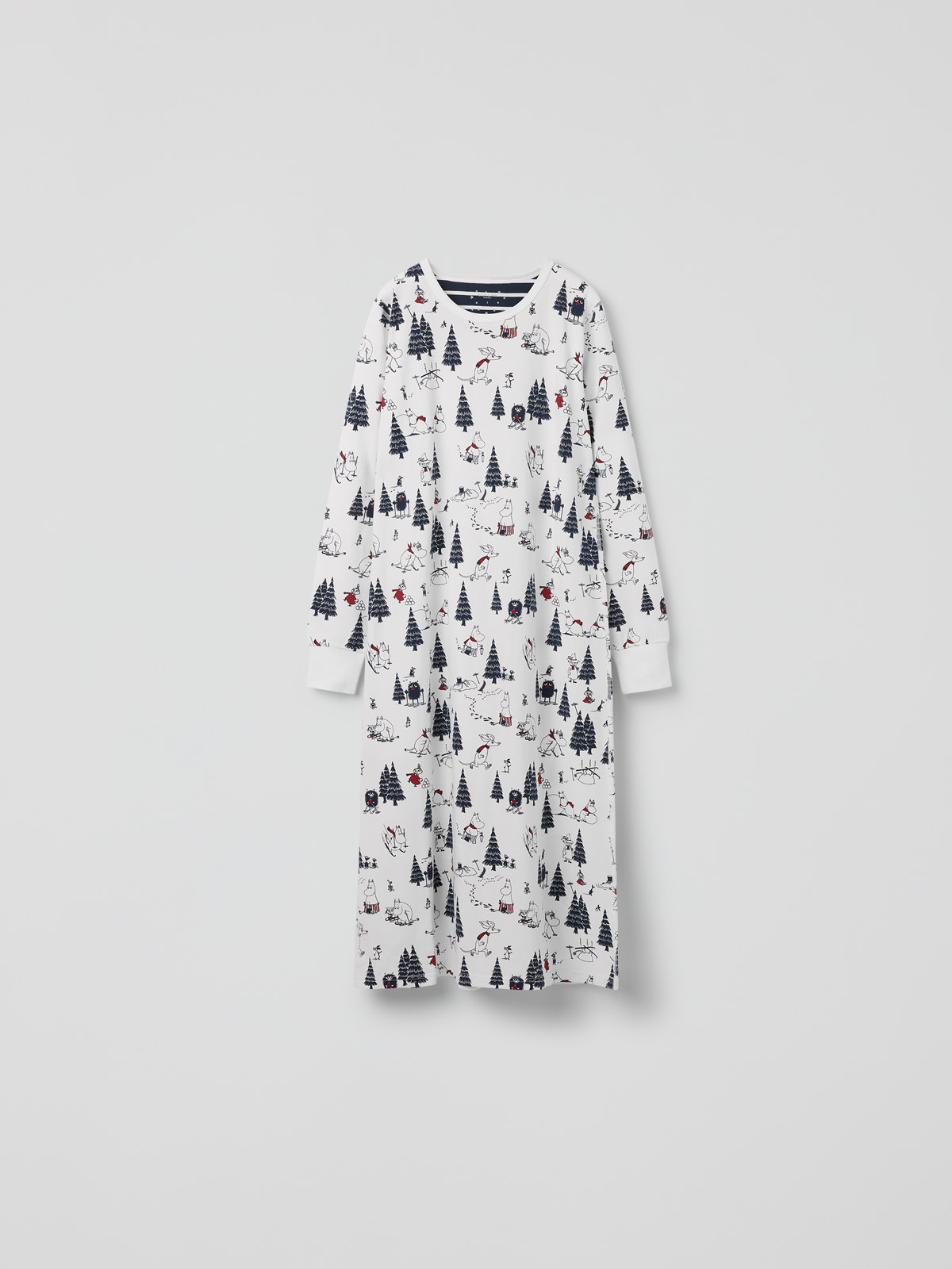 Myk og deilig nattkjole i økologisk bomull til voksen – en del av vårt kjære designsamarbeid for å feire Mummis 80-årsjubileum i 2025. Nattkjolen er helmønstret med illustrasjoner fra Tove Janssons fortellinger om Mummitrollet.