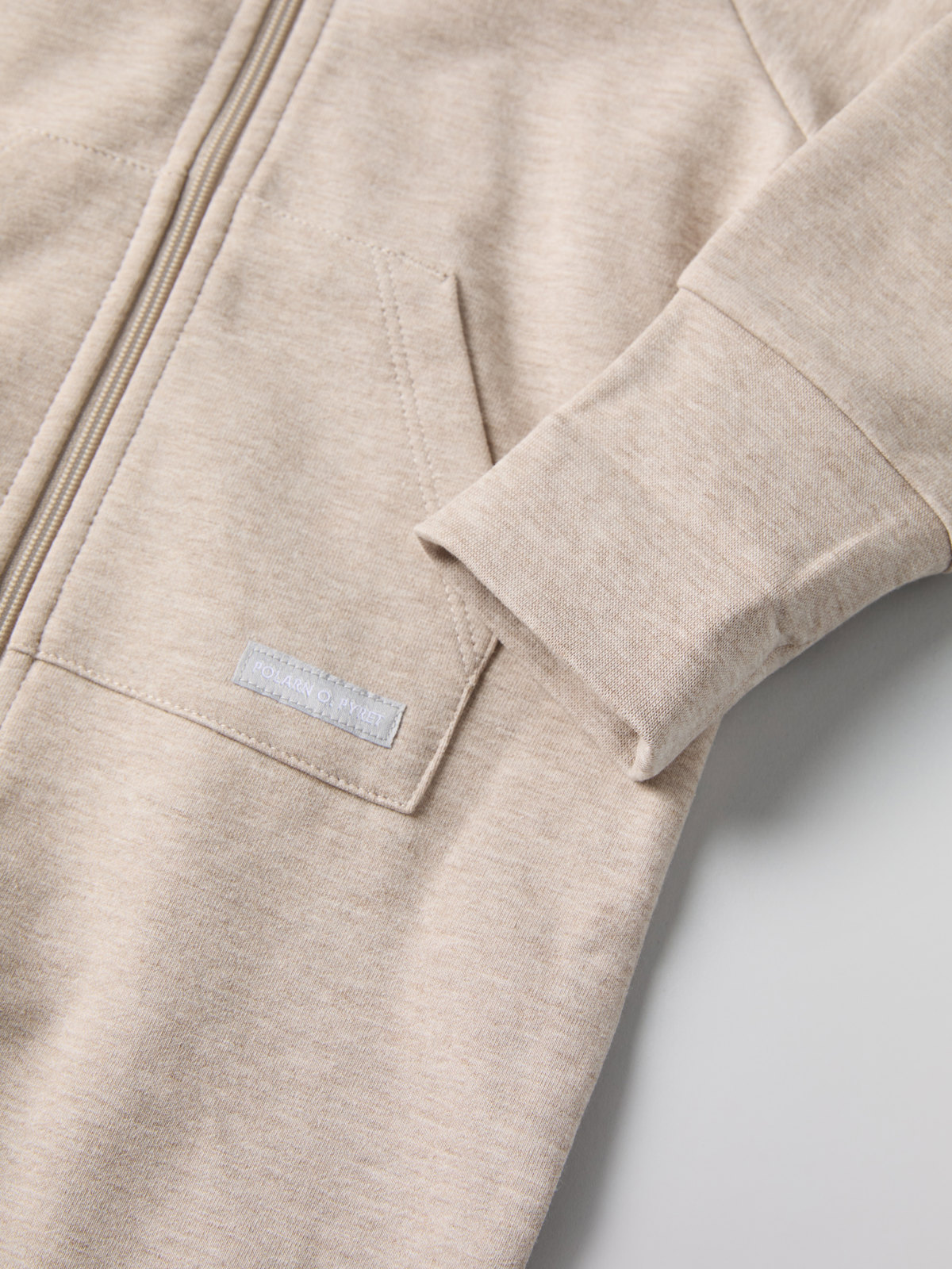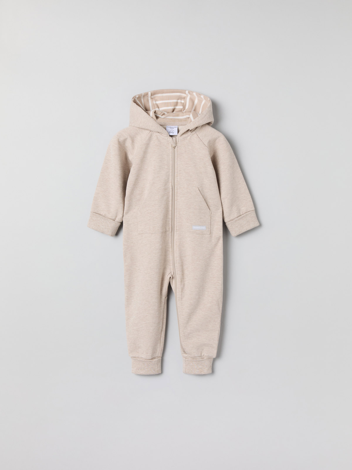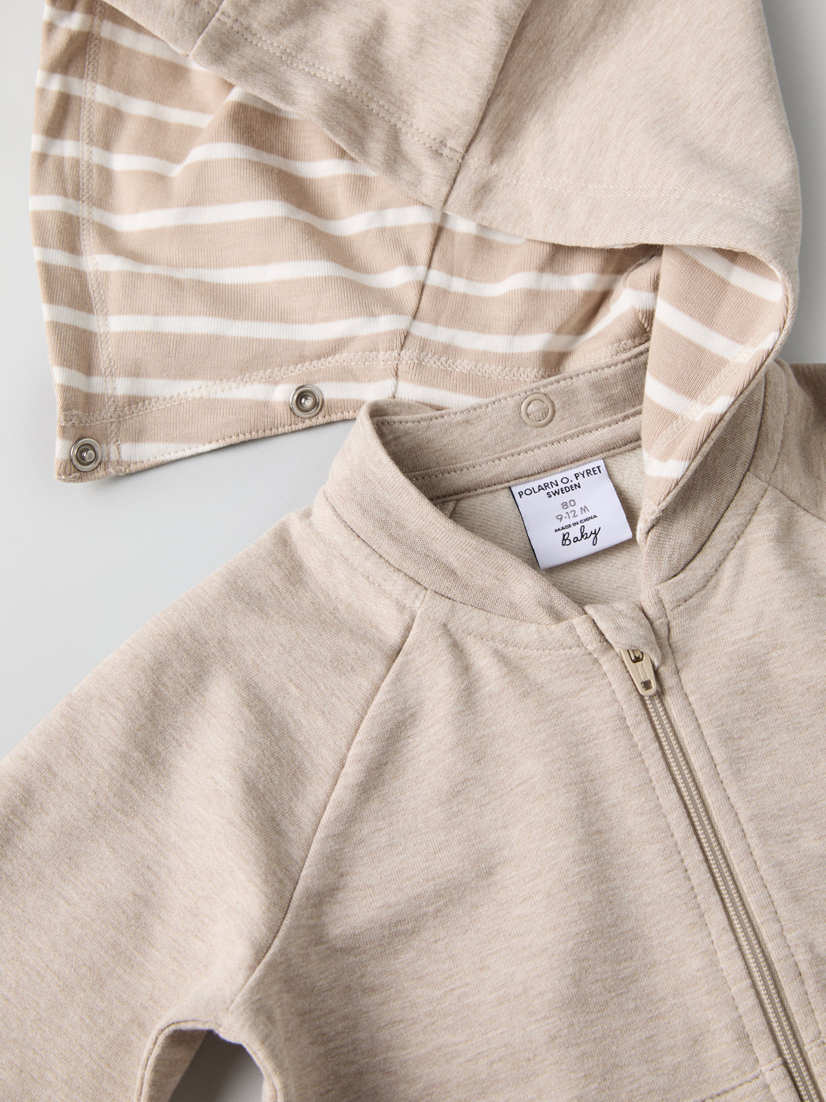 Dressen er fremstilt i myk økologisk bomull og har fast hette med trikotfôr i våre klassiske striper. Den lange glidelåsen fra hals til nederst på bena gir enklere klesskift, og har også en beskyttelse øverst for å hindre at den gnager mot hake og kinn. I tillegg har dressen en smart kengurulomme og ekstra lange vrangborder nederst på ermer og ben, som kan brettes ned etter hvert som barnet vokser. Størrelse 80 har avtakbar hette som kan festes med trykknapper.