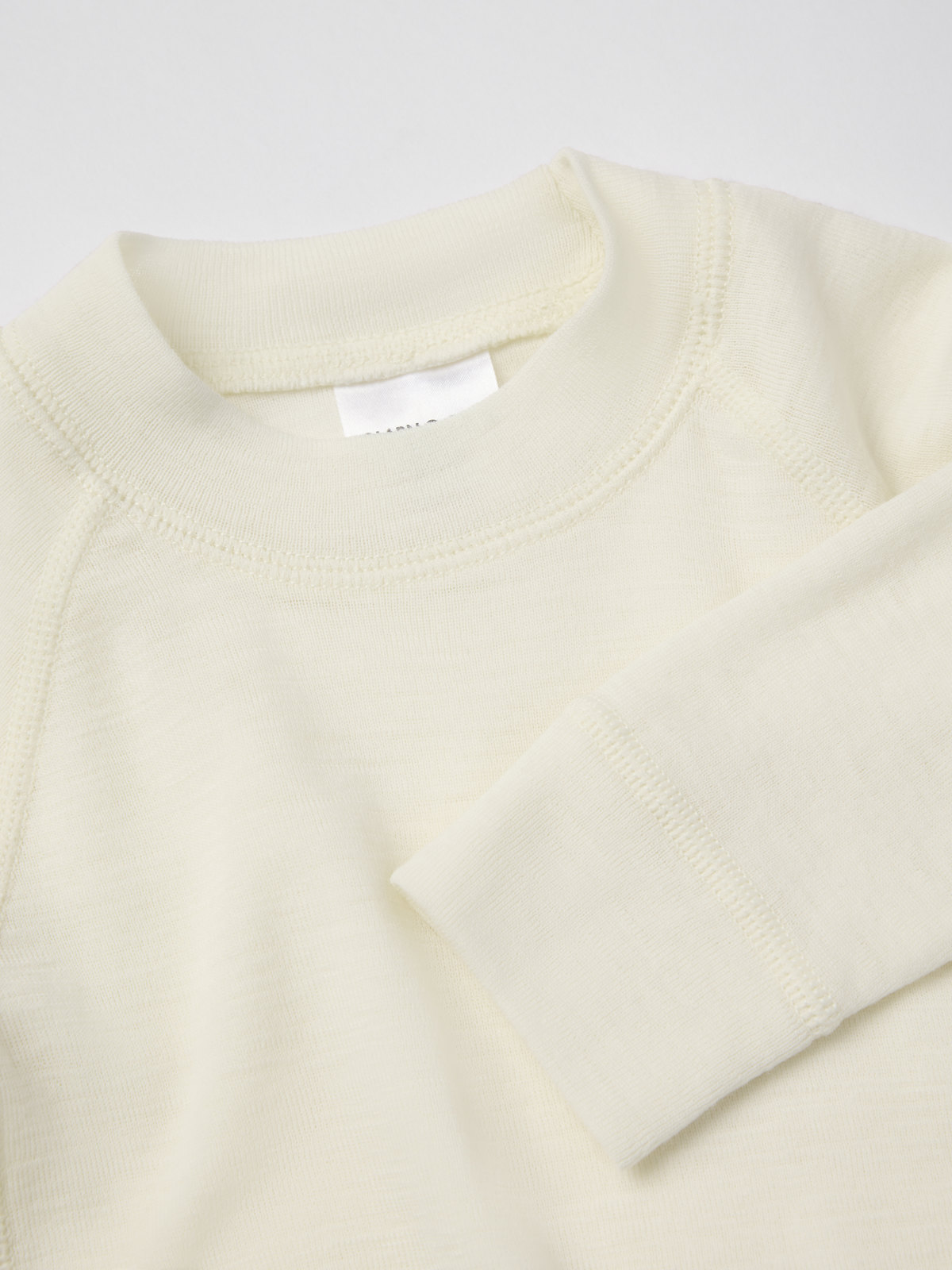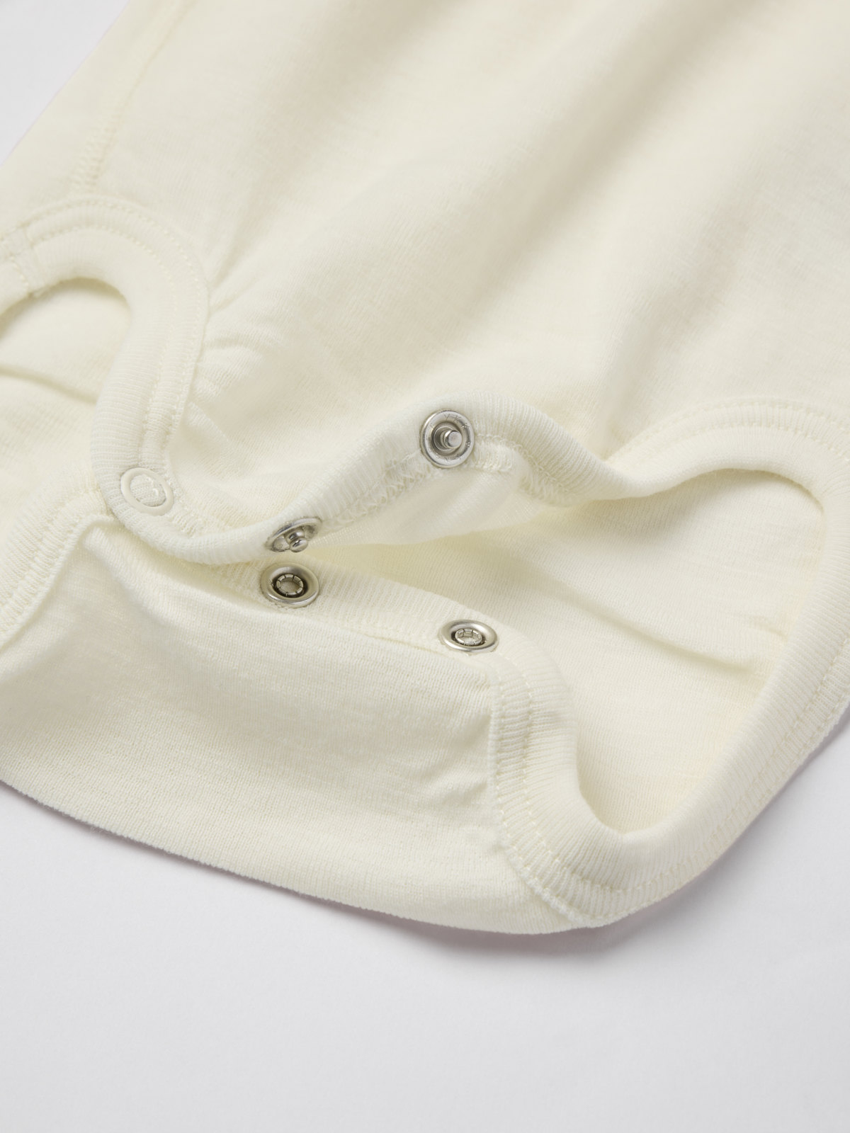 Langermet body i varmende merinoull til baby. Et perfekt første lag under vinterdressen! Merinoull varmer også i våt tilstand og bidrar til å regulere kroppstemperaturen. Bodyen har ekstra myke sømmer som ikke gnager og trykknapper i skrittet, noe som gir et enklere kles- og bleieskift.