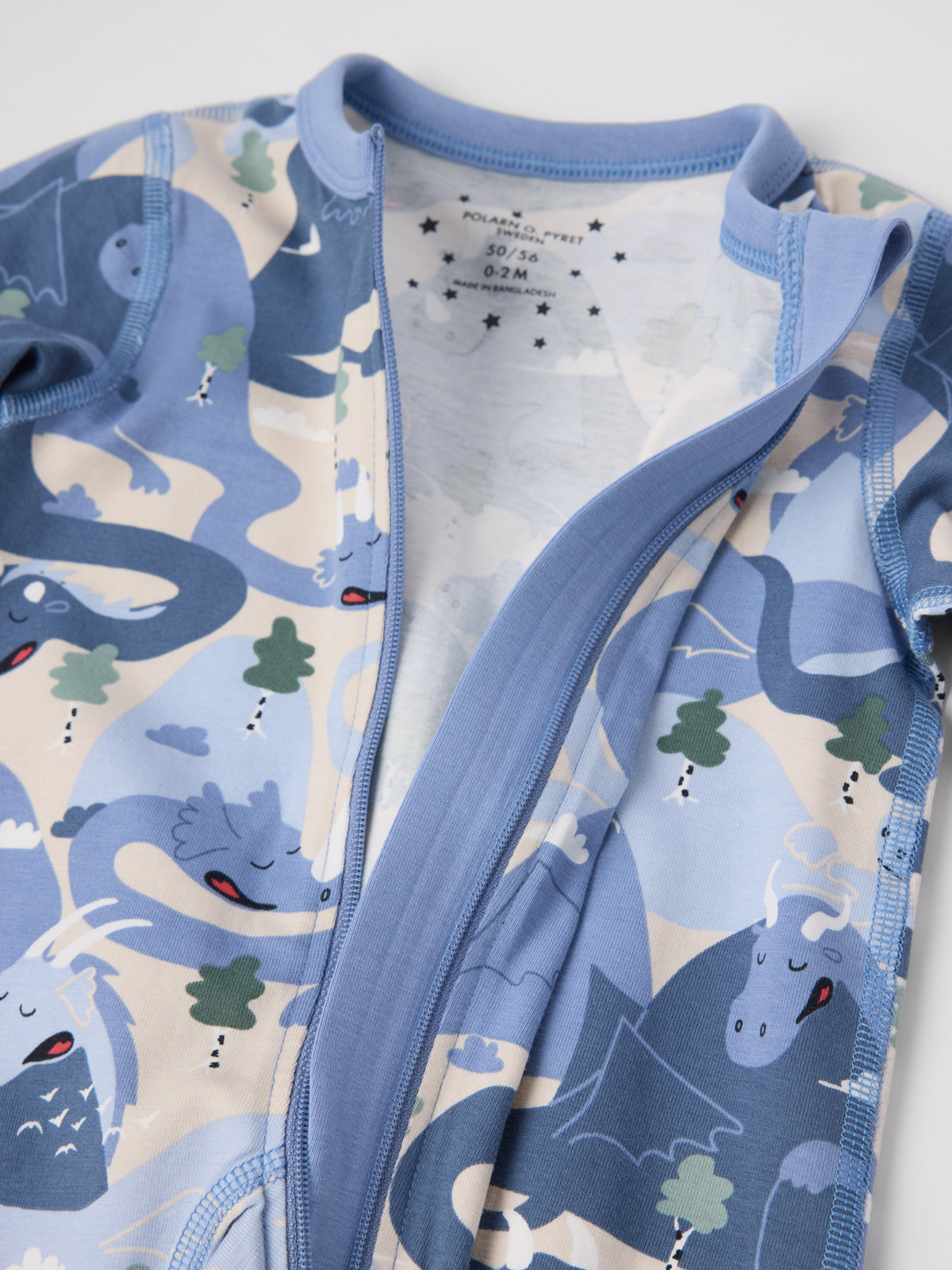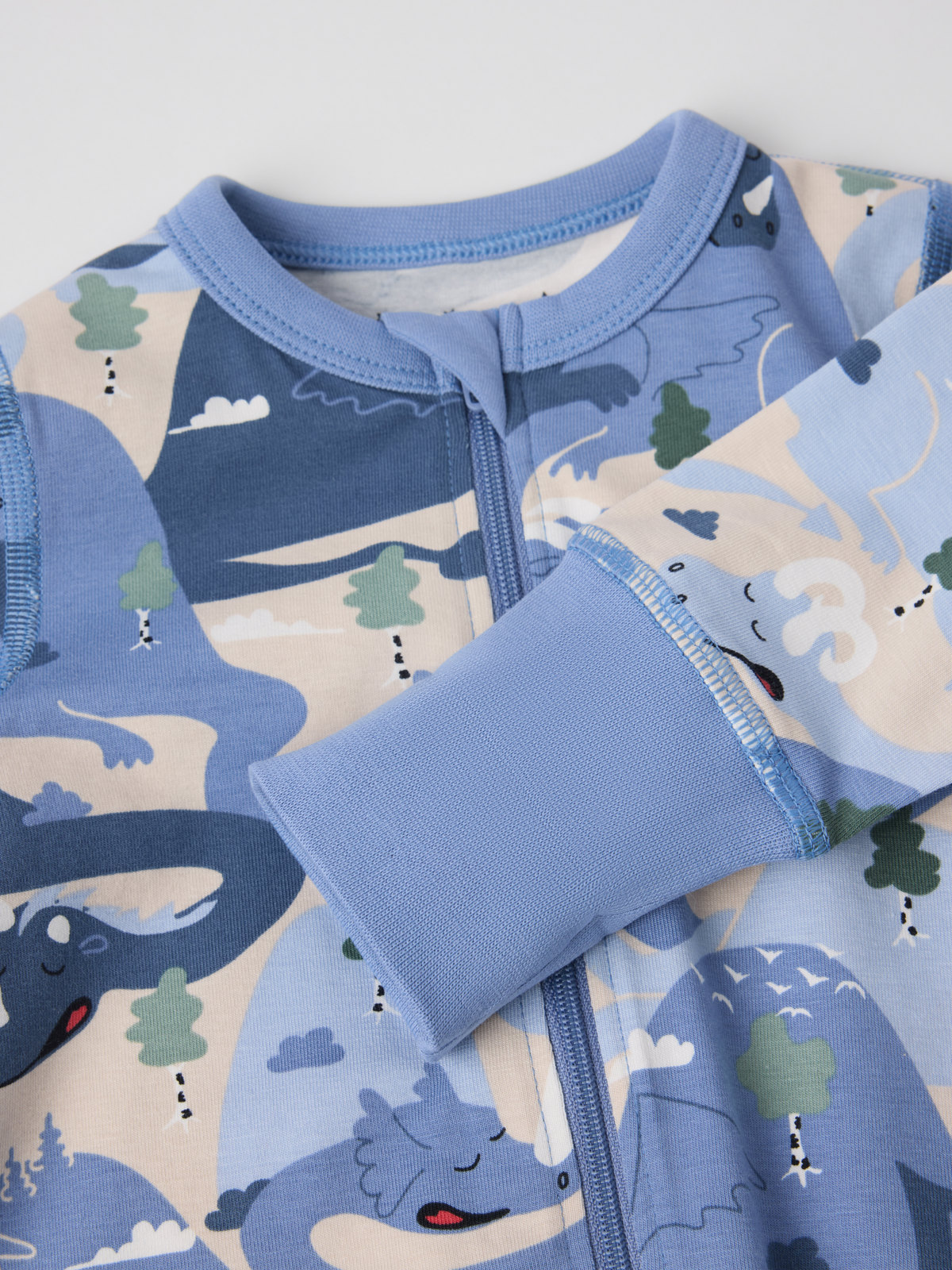 Hel pyjamas i myk økologisk bomull, med ekstra myke og flate sømmer som er skånsomme mot følsom hud. Vrangborden nederst på ermene og bena er ekstra lang og kan brettes ned etter hvert som barnet vokser. Den lange glidelåsen fra halsen til nederst på bena kan åpnes både ovenfra og nedenfra, noe som gir enklere klesskift.