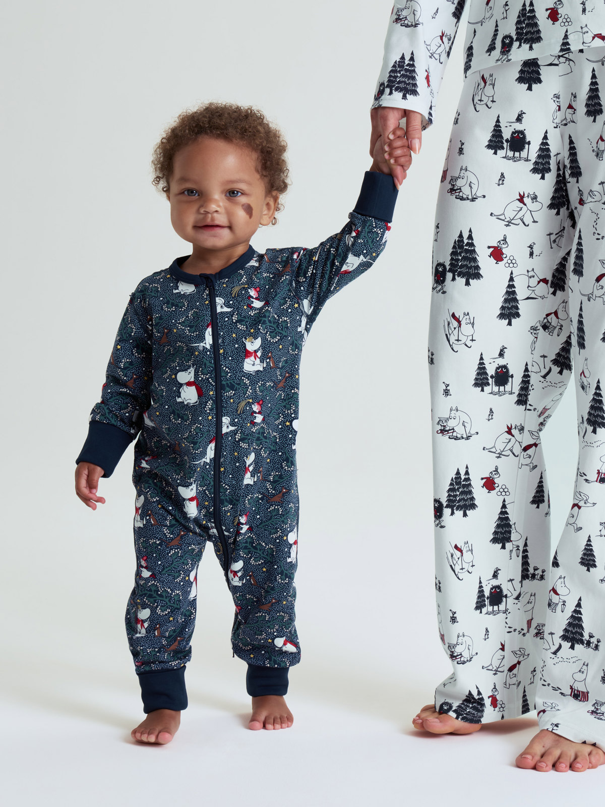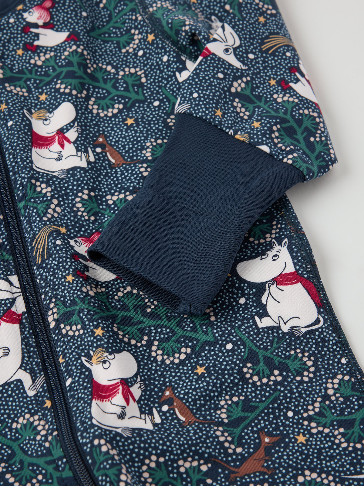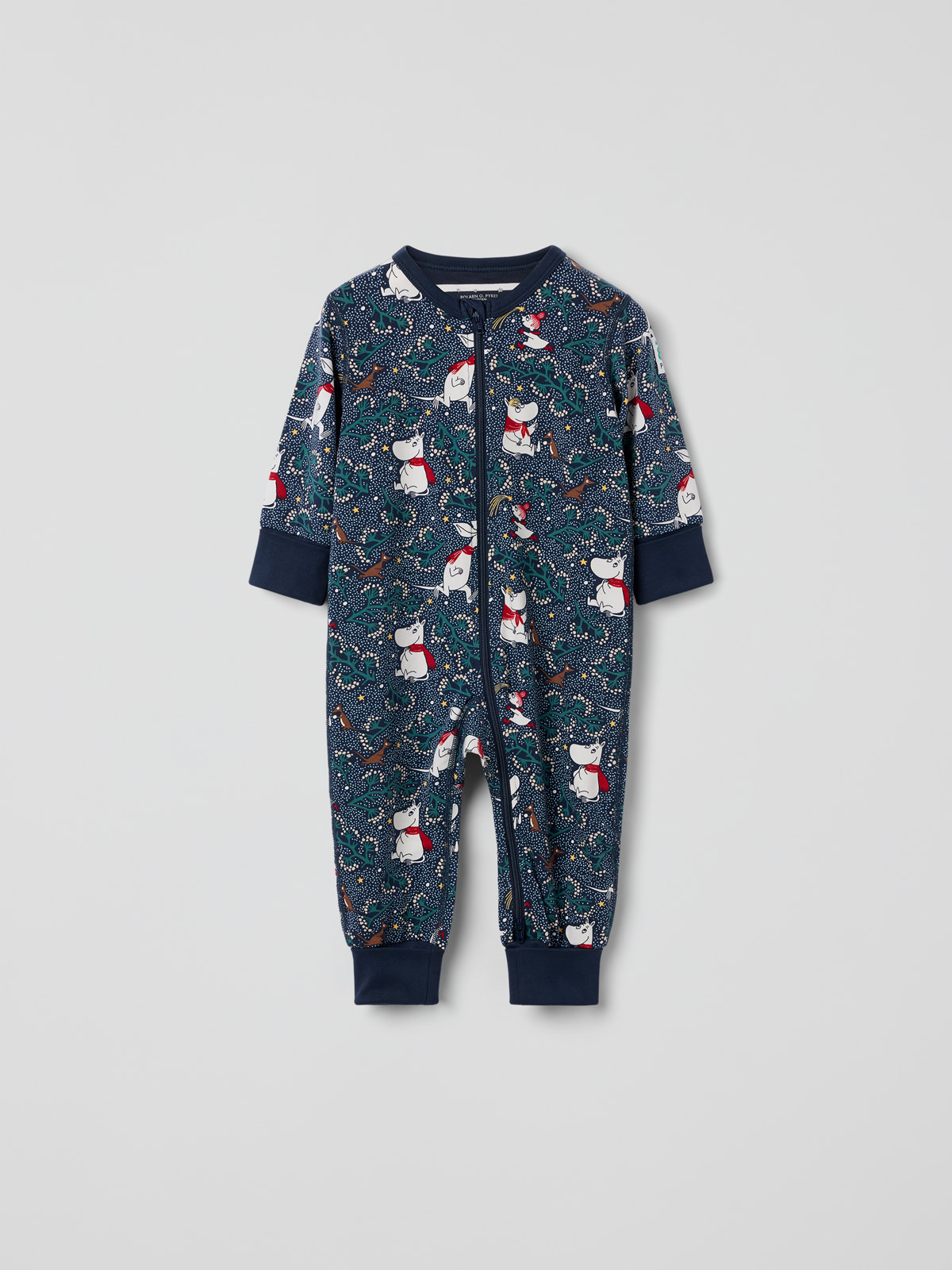 Pysjamasoverall i myk økologisk bomull – en del av vårt kjære designsamarbeid for å feire Mumins 80-årsjubileum 2025. Overallen er heltrykt med illustrasjoner fra Tove Janssons historier om Mummitrollet. Mansjettene ved erme- og benavslutningene er ekstra lange og kan brettes ned etter hvert som barnet vokser. Den lange glidelåsen fra hals til benavslutning kan åpnes både ovenfra og nedenfra for å gjøre klesskift enklere.