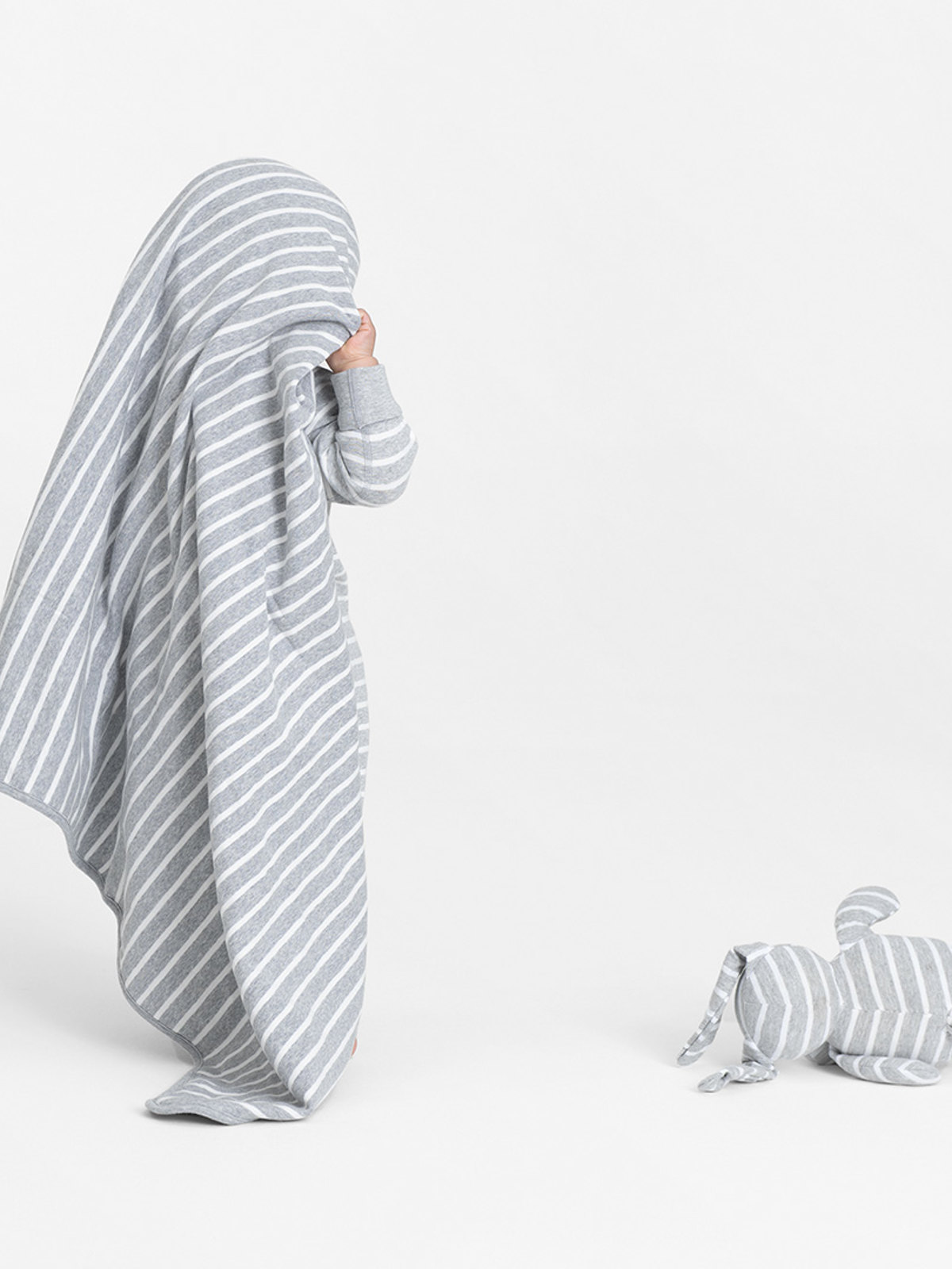 Teppe i våre klassiske striper. Ensfarget på den ene siden. Mål: 84 x 84 cm.