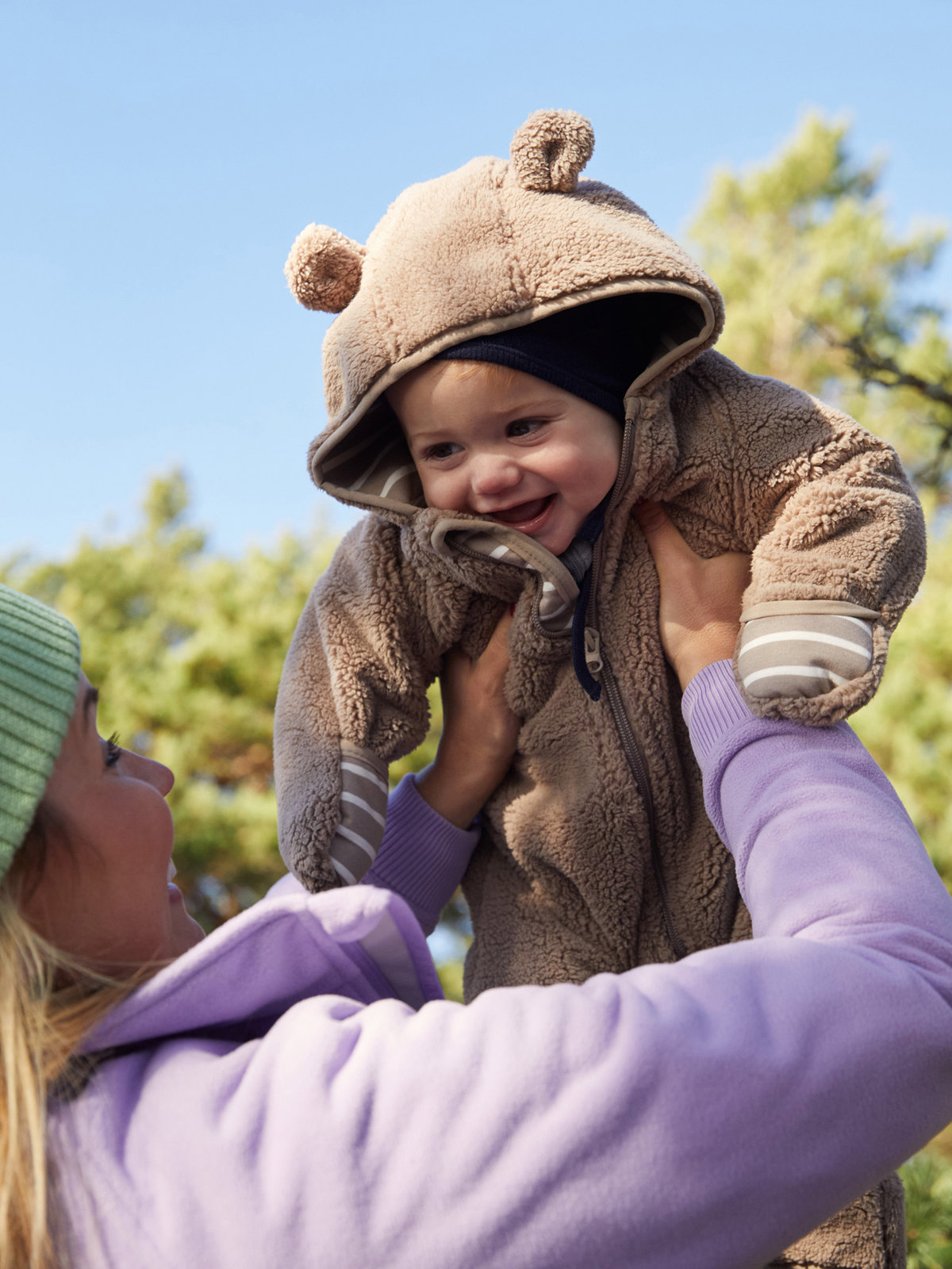 Vindtett og vannavvisende dress i myk pile til baby – en skikkelig koselig favoritt i vognen!
