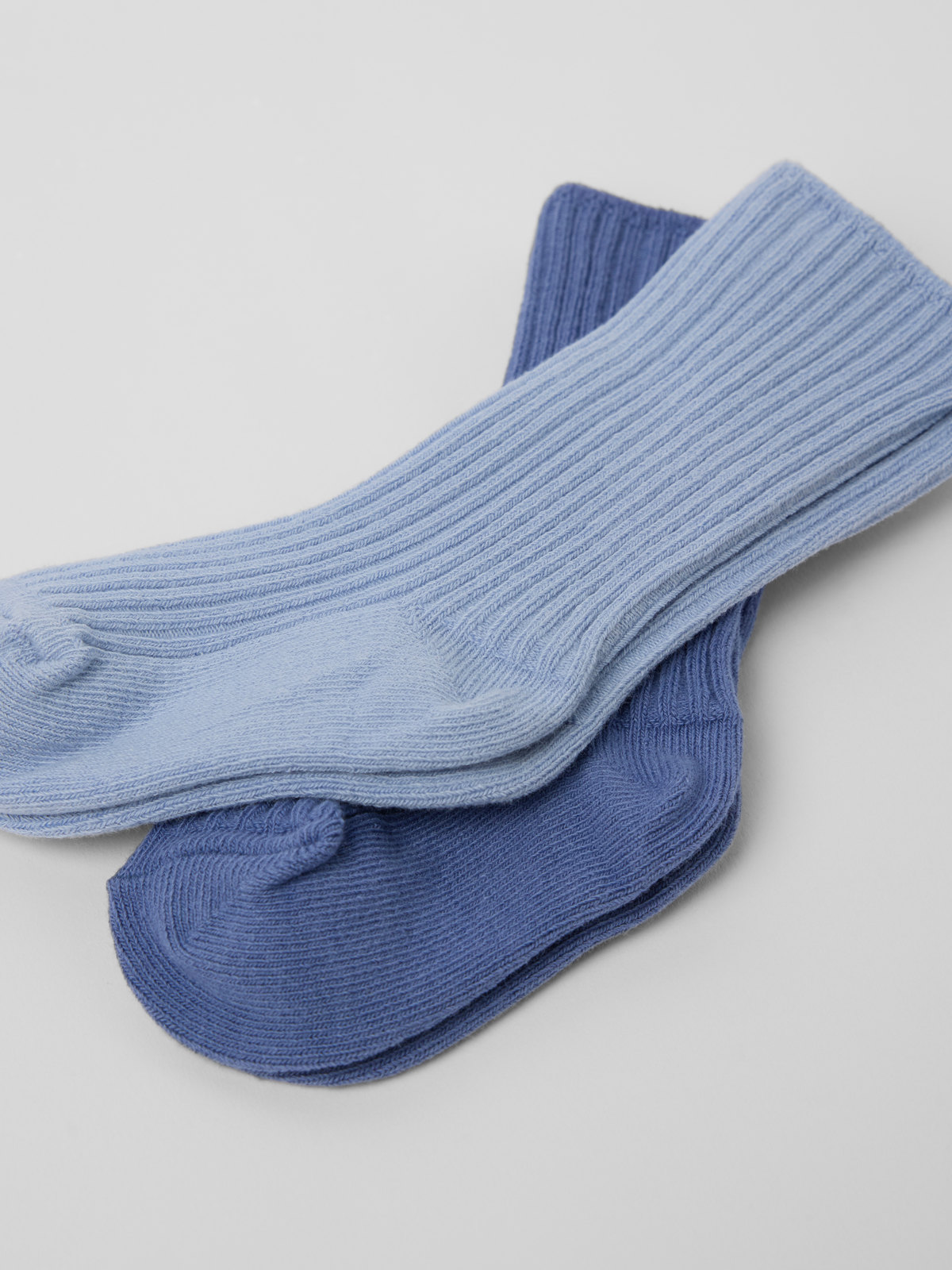 Fyll på sokkeskuffen med to par ensfargede sokker i myk økologisk bomull til baby. Sokkene har myk vrangbord som kan brettes ned og som ikke gnager.
