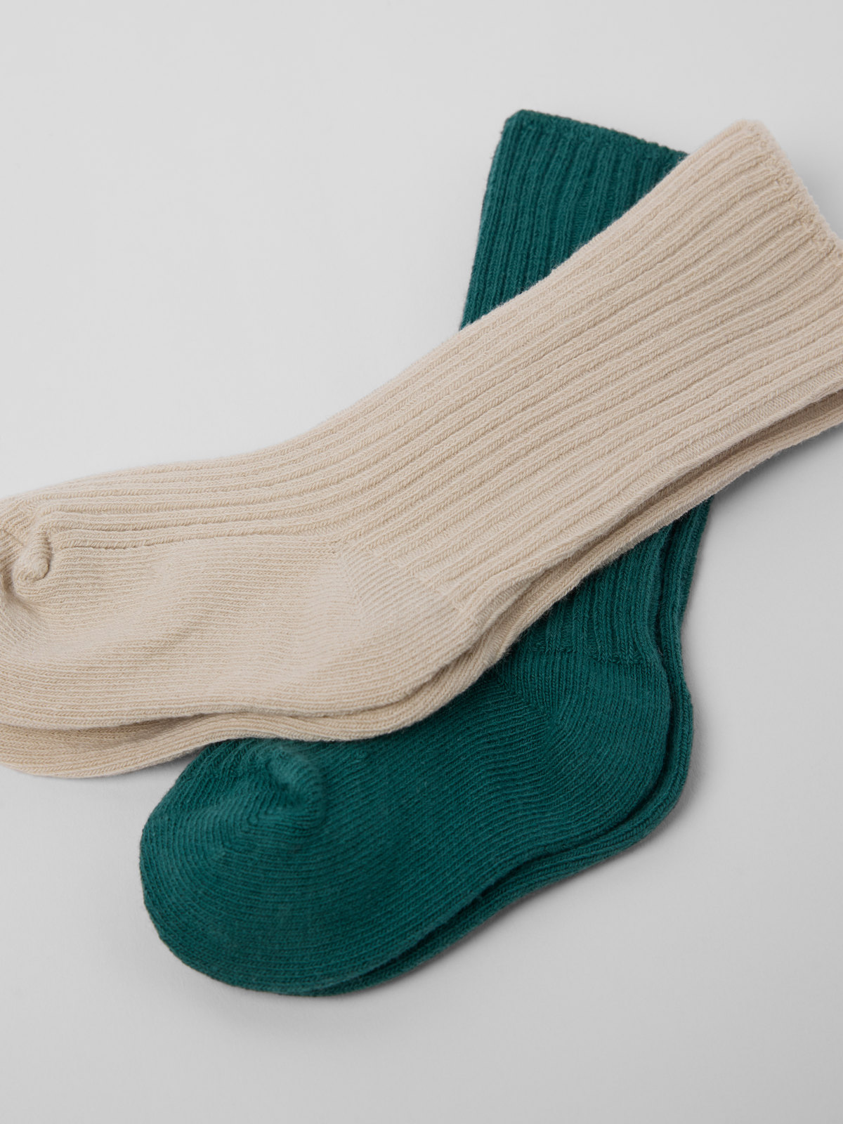 Fyll på sokkeskuffen med to par ensfargede sokker i myk økologisk bomull til baby. Sokkene har myk vrangbord som kan brettes ned og som ikke gnager.