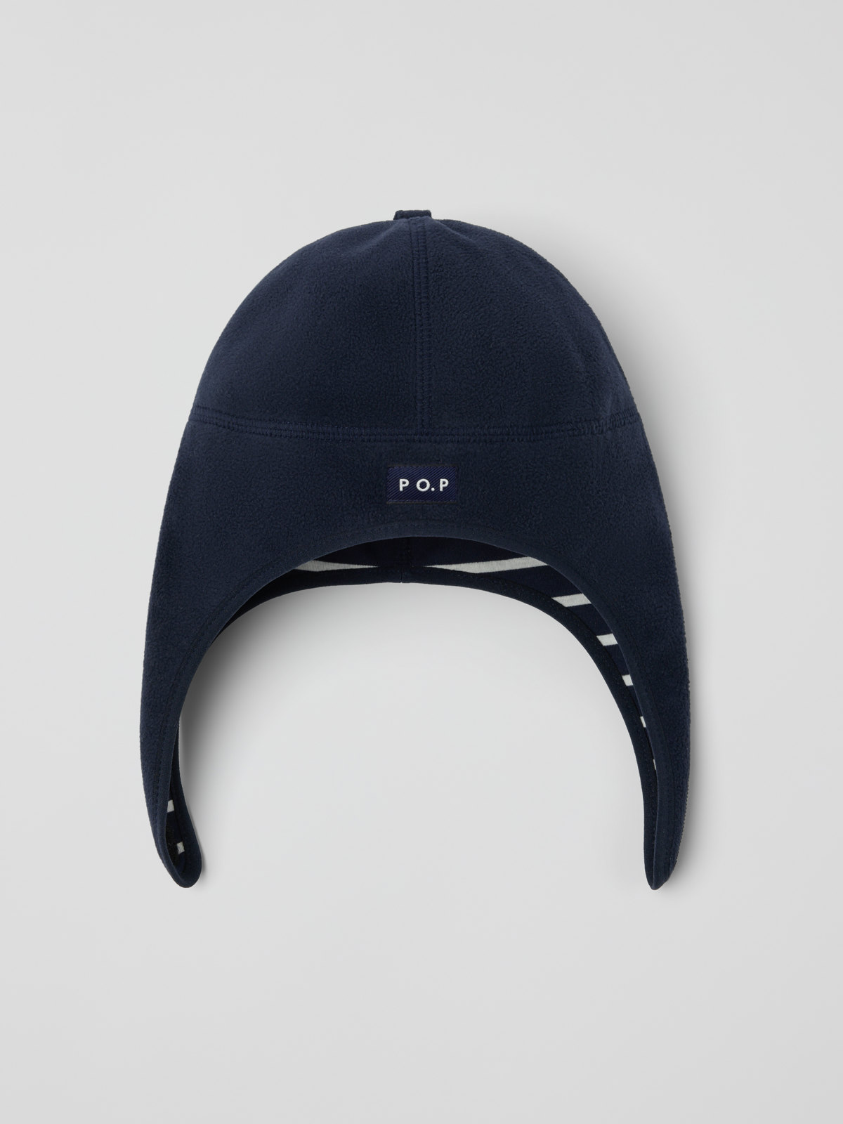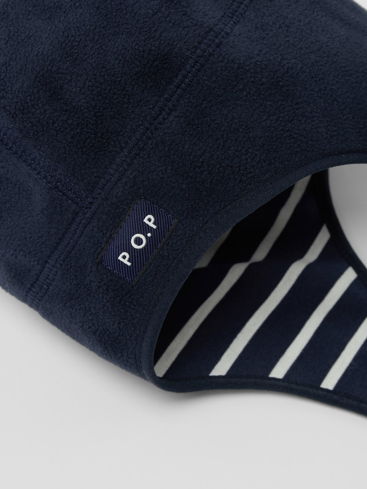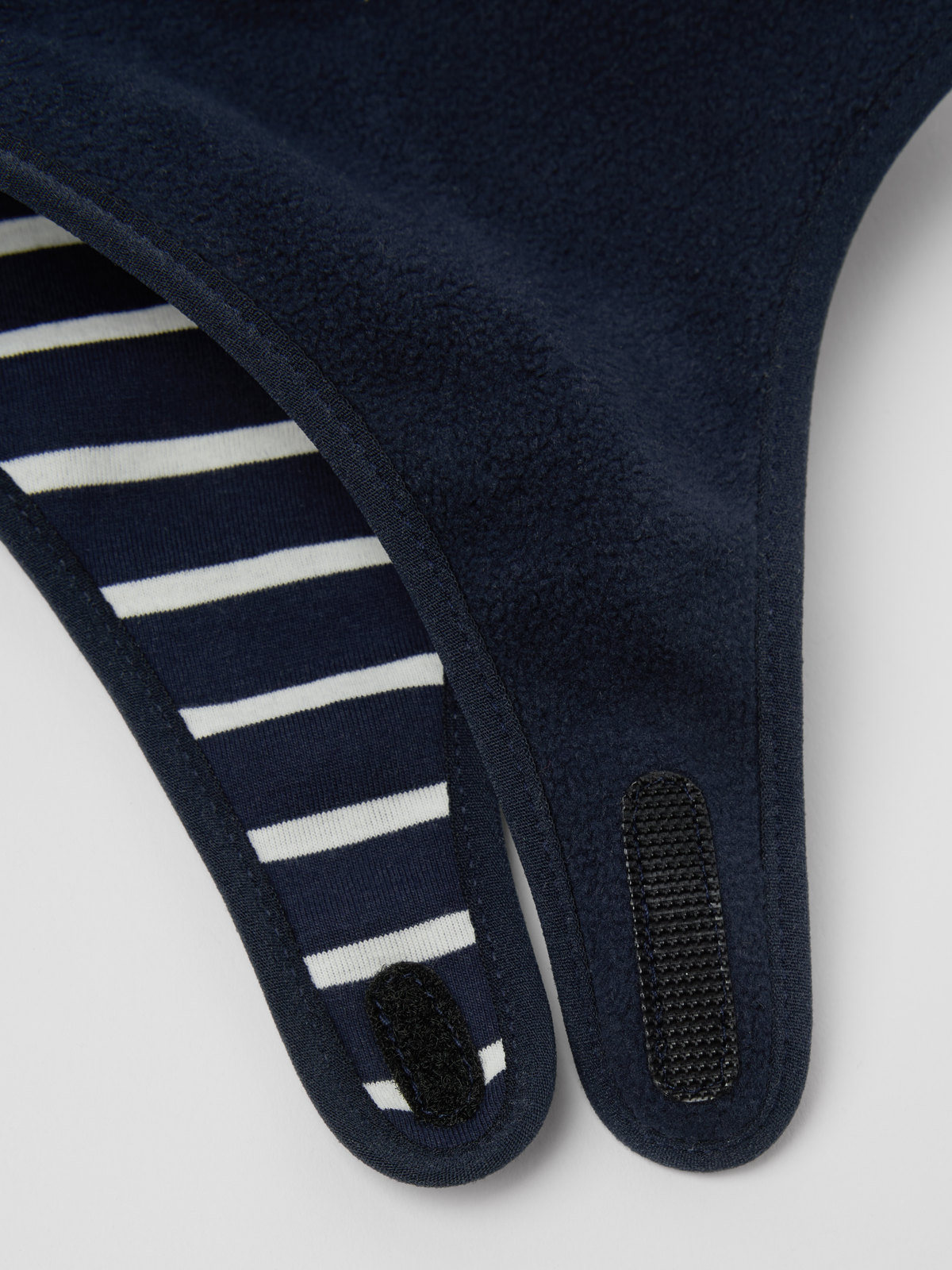 Vindtett og vannavvisende hjelmlue i myk fleece til baby. Luen er fremstilt i resirkulert polyester, og innsiden er fôret med myk økologisk bomullstrikot med våre klassiske striper. Luen lukkes med borrelås under haken.