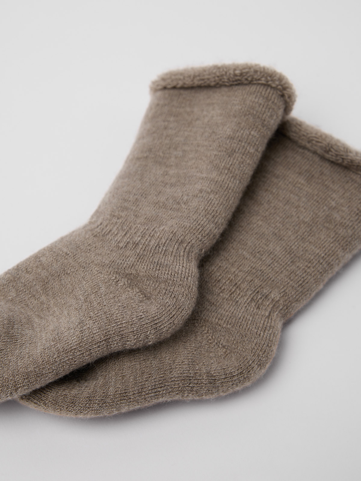 Sokker i tykk, myk ullfrotté som holder små føtter varme og gode i kulden. Sokkene kan brettes opp eller ned for perfekt passform.