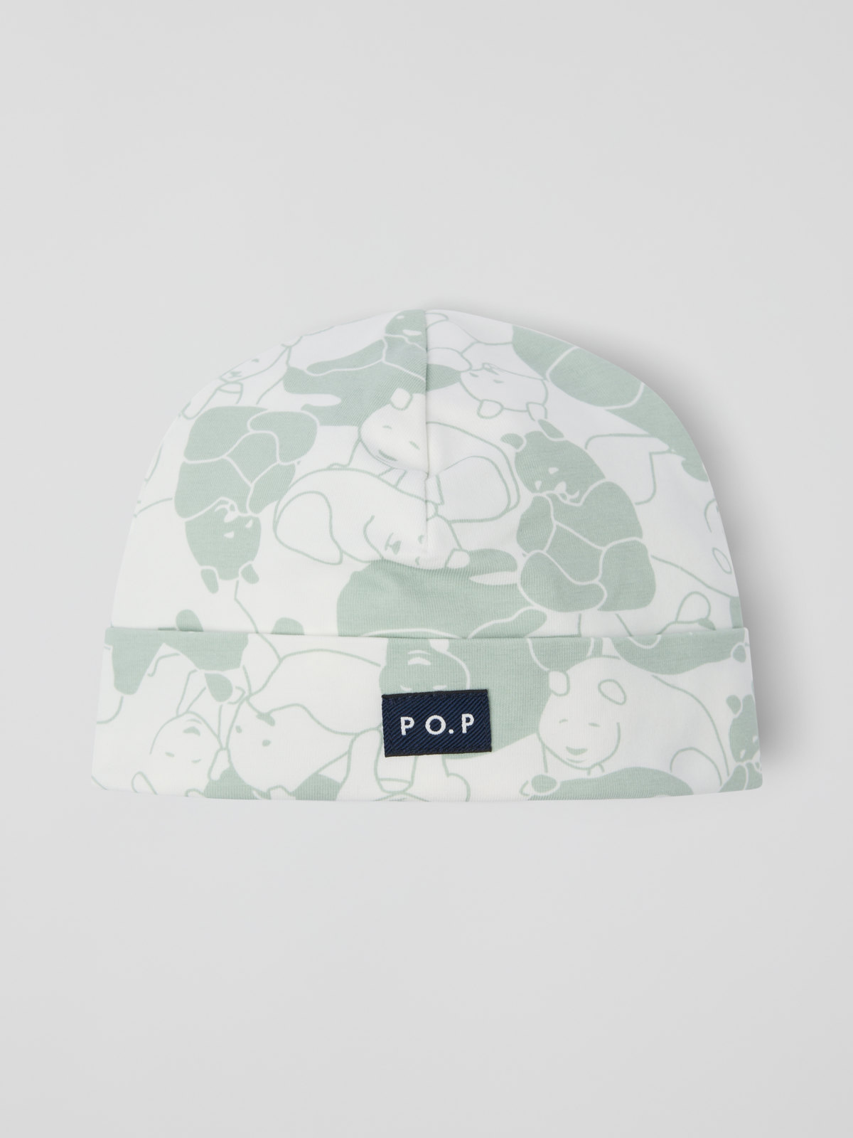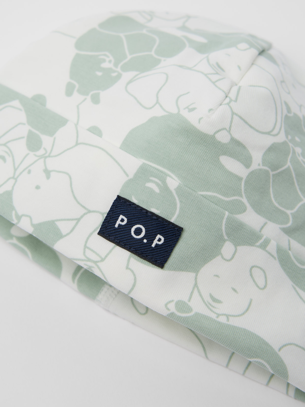 Ekstra myk lue i 100 % økologisk bomullstrikot til baby. Luen er sydd med ekstra myke sømmer som ikke gnager mot følsom hud, og har en oppbrett med en liten PO.P label foran.