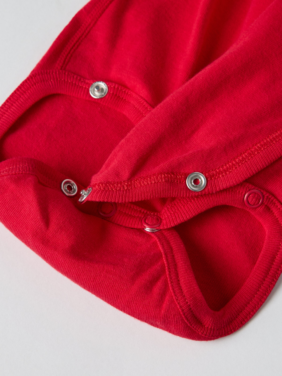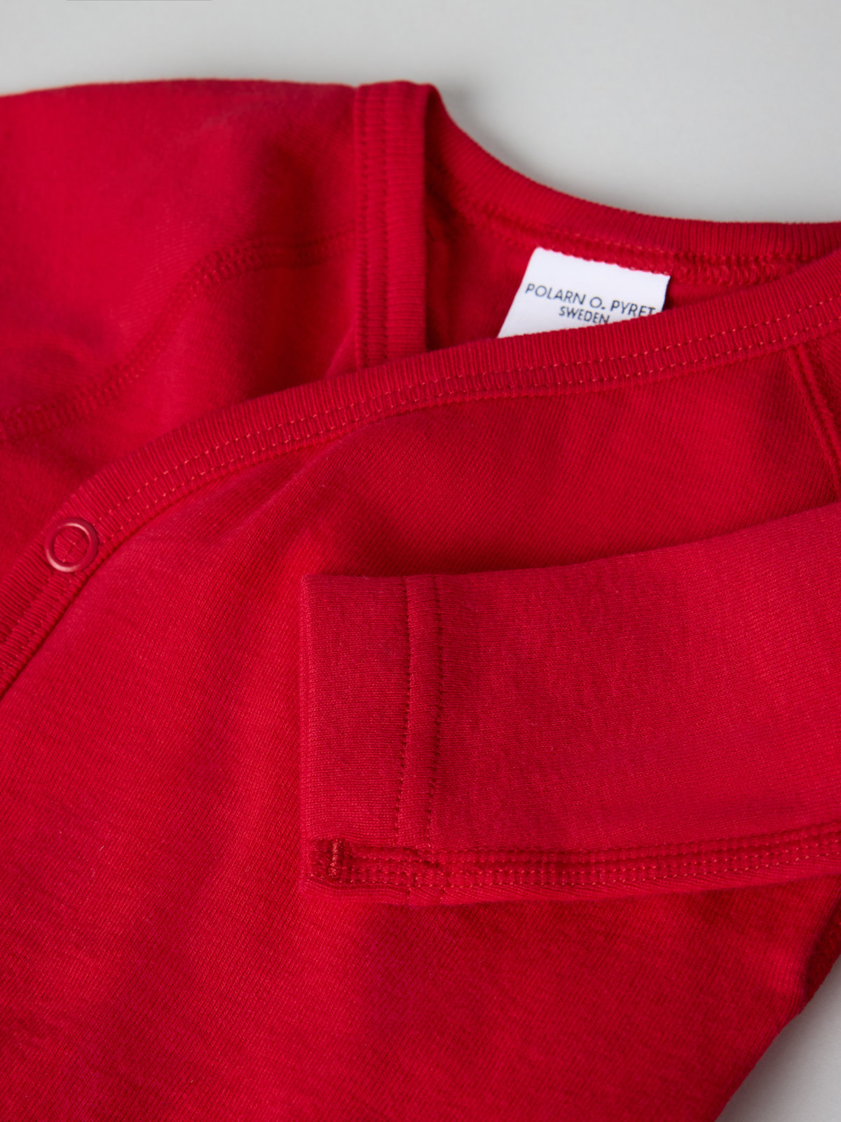 Omslagsbody i økologisk bomull til nyfødt. Bodyen har våre klassiske striper og myk, ribbestrikket vrangbord nederst på ermene, som kan brettes ned etter hvert som babyen vokser. Trykknappene langs omslagsåpningen og i skrittet gir enklere kles- og bleieskift.