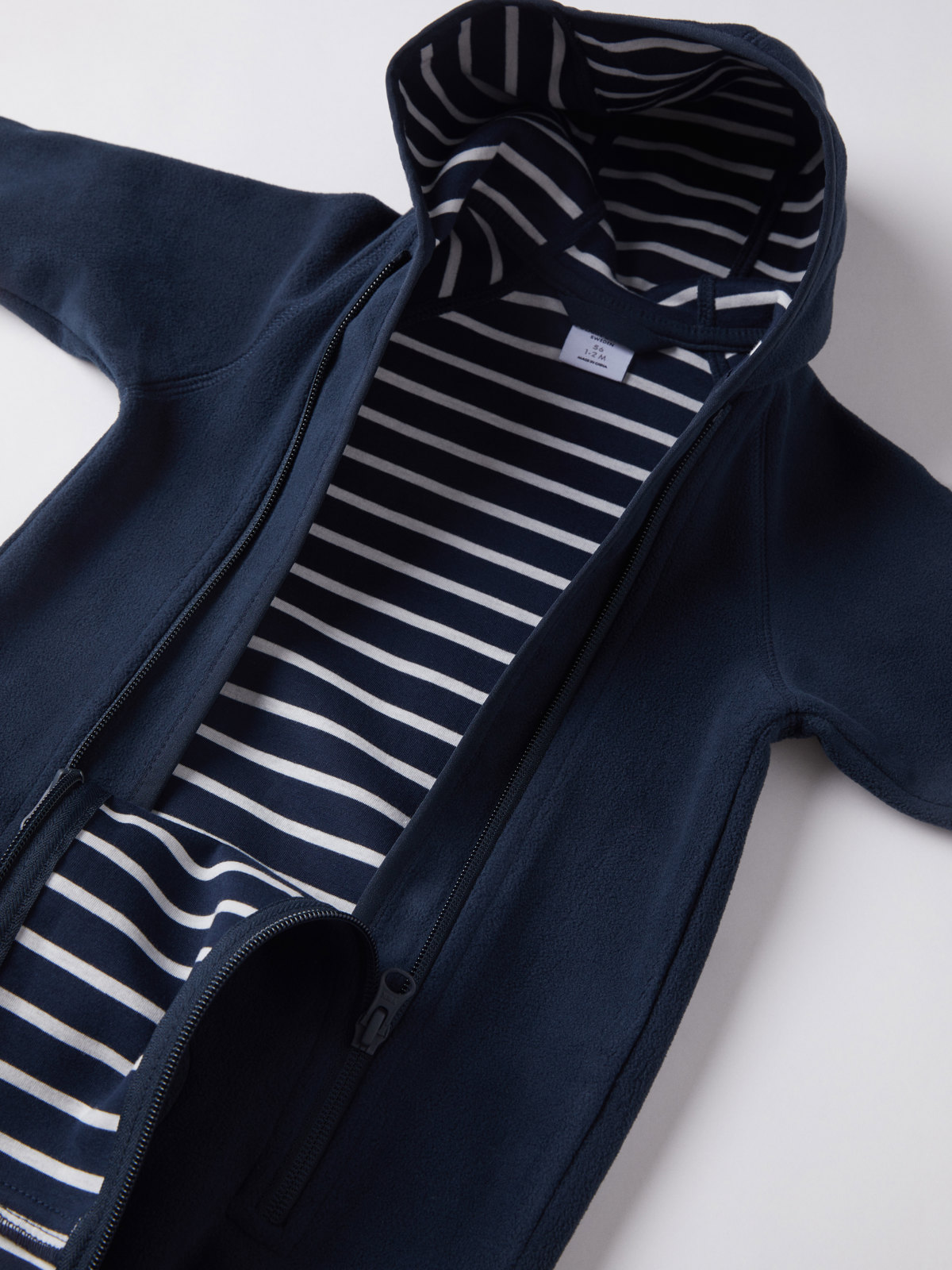 Dressen er fremstilt i resirkulert polyester med god pusteevne, og er fôret med myk trikot i 100 % økologisk bomull med våre klassiske striper. Den har hette og doble glidelåser foran for enklere klesskift. Glidelåsene har en vindklaff på innsiden, som gir ekstra beskyttelse mot kald luft, og en beskyttelse øverst som hindrer at de gnager mot hake og kinn.