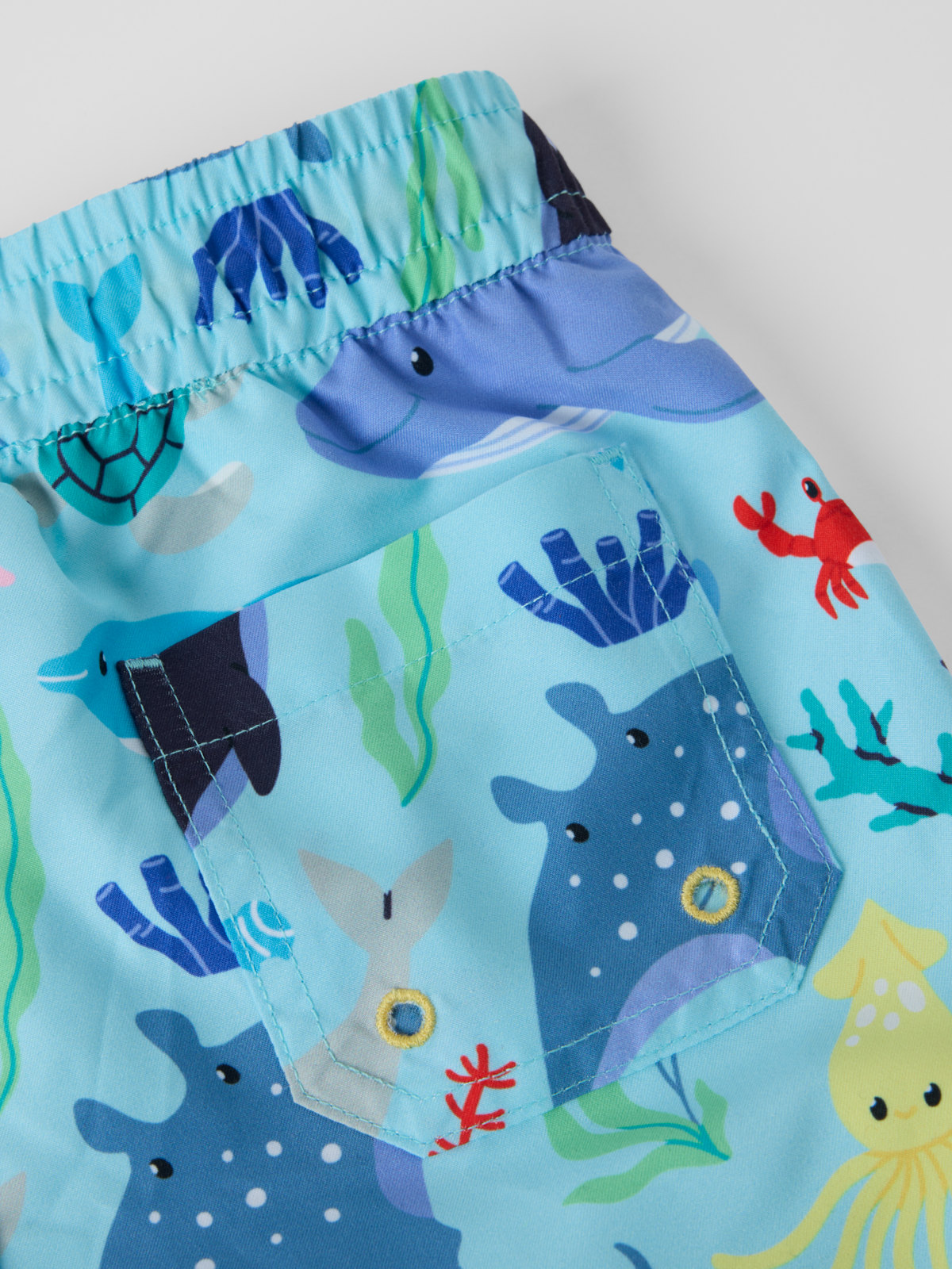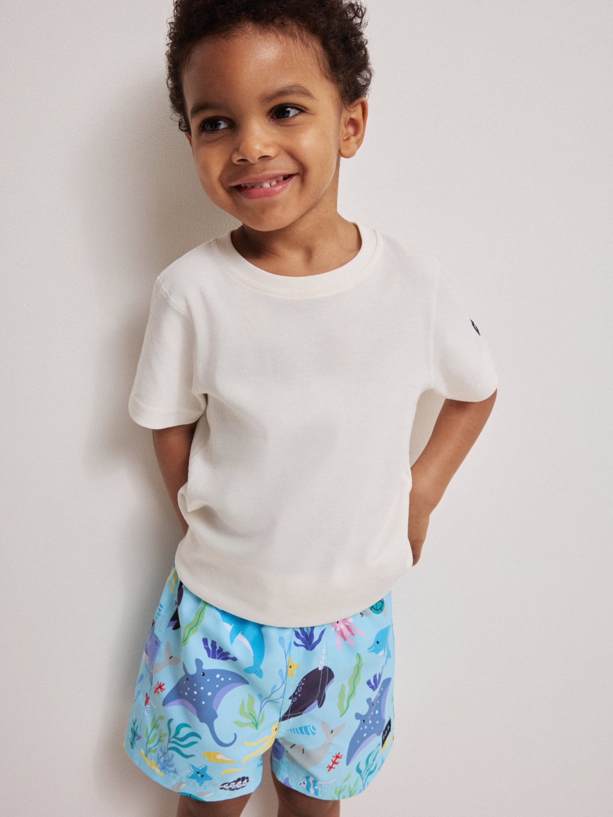 Badeshorts med elastisk midje og snøring, laget av resirkulert polyester. Shortsen har en myk innerbukse i mesh og en baklomme.