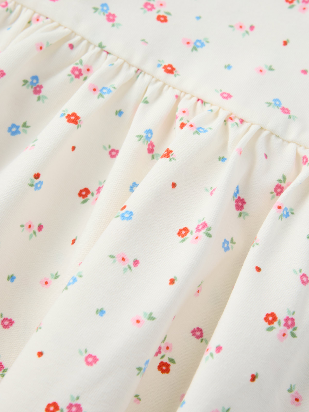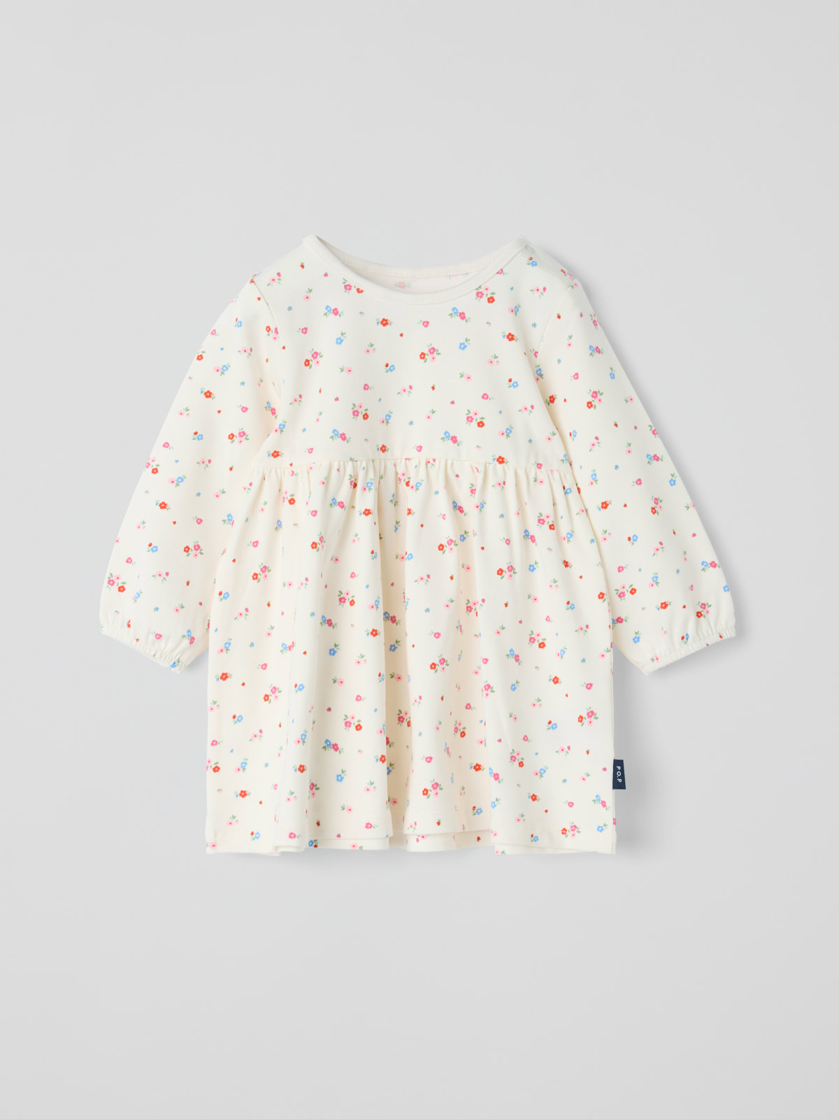 Kjole i tynn økologisk bomullsjersey – fin til både hverdag og fest! Kjolen har høyt liv og rynket skjørt. Ermene har elastikk nederst. Trykknapper på den ene skulderen gjør klesskift enklere.