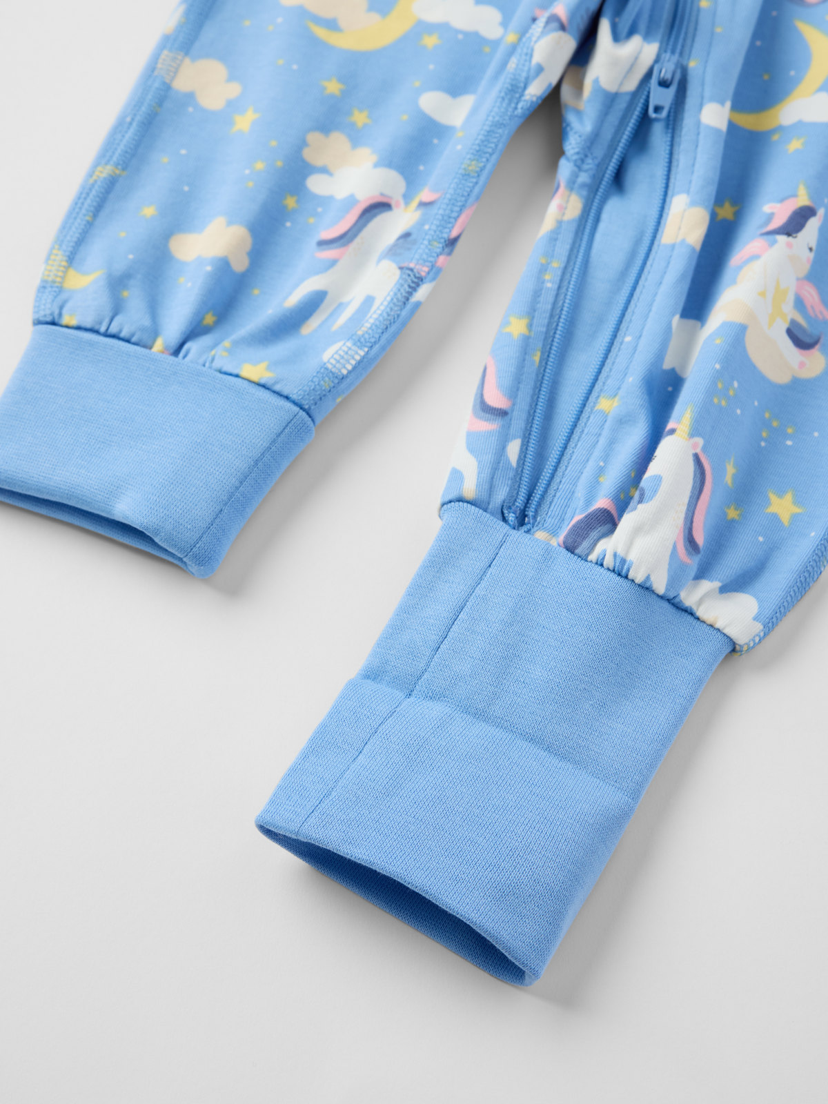 Hel pyjamas i myk økologisk bomull, med ekstra myke og flate sømmer som er skånsomme mot følsom hud. Vrangborden nederst på ermene og bena er ekstra lang og kan brettes ned etter hvert som barnet vokser. Den lange glidelåsen fra halsen til nederst på bena kan åpnes både ovenfra og nedenfra, noe som gir enklere klesskift.
