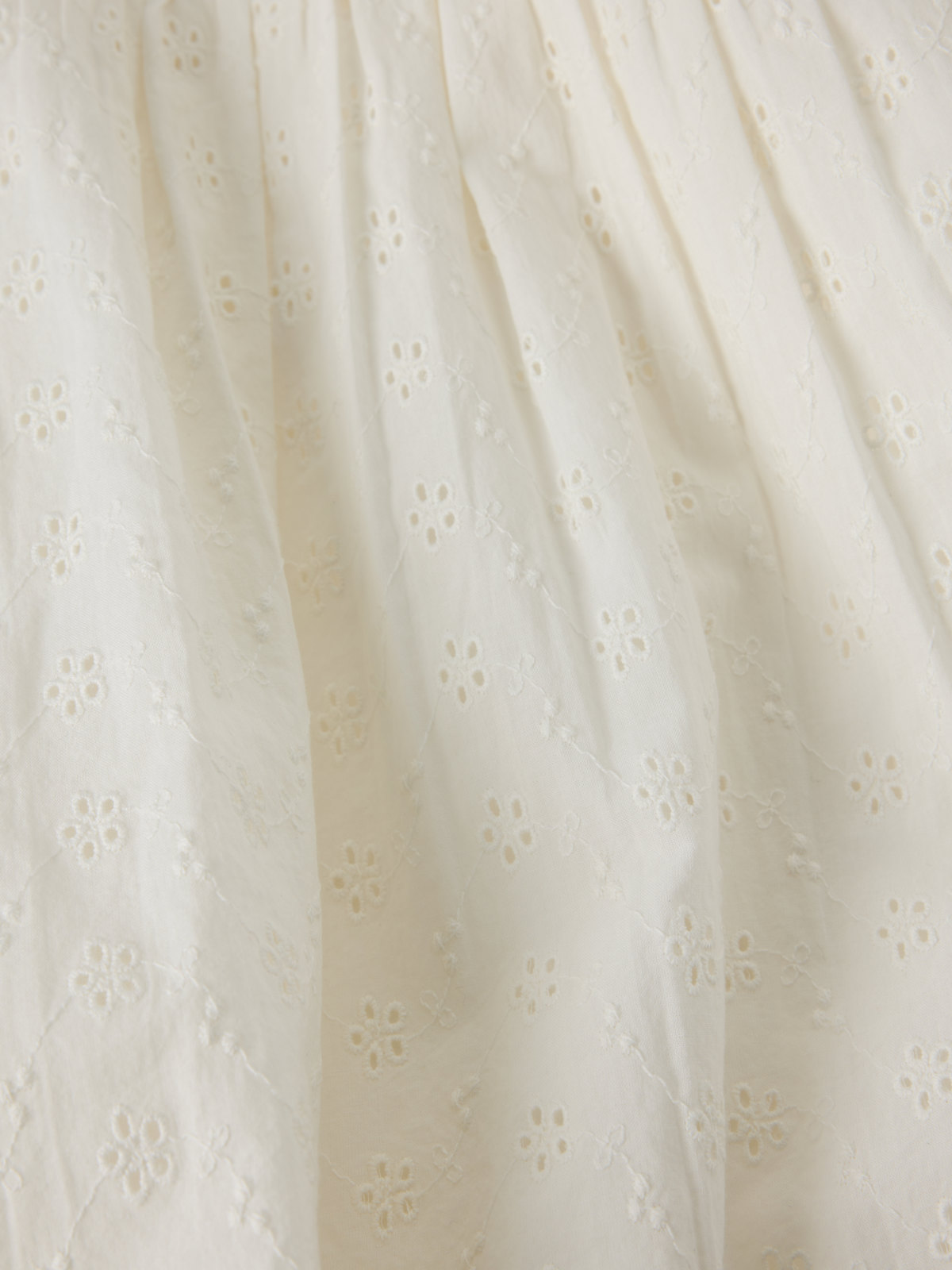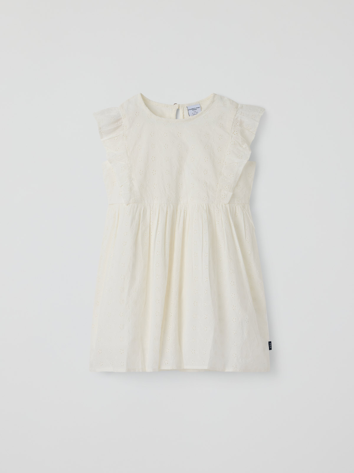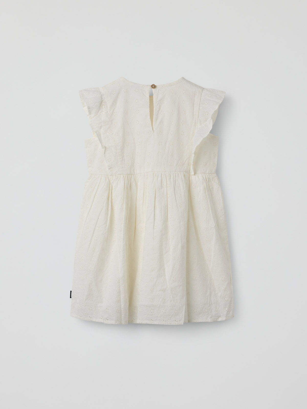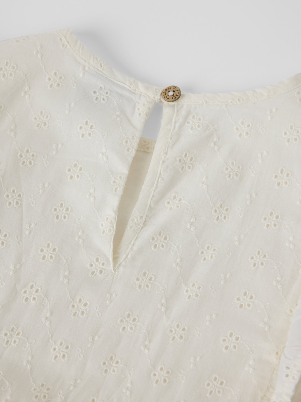 Søt kjole i myk musselin av 100 % økologisk bomull – et selvsagt valg til sommerens festligheter! Kjolen har myke volanger over skuldrene og nydelig broderi på brystet. Lukkes med knapp i ryggen. Perfekt for søskenmatch!