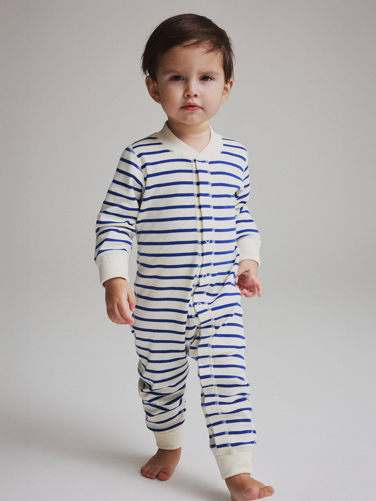 Vår klassiske stripete heldress i myk økologisk bomull – perfekt både som pysjamas og kosedress! Heldressen har ekstra myke, flate sømmer som er skånsomme mot sensitiv hud. Mansjettene på ermer og ben er ekstra lange og kan brettes ned etter hvert som barnet vokser. Den lange knappestolpen fra hals til fot gjør klesskift enkelt.