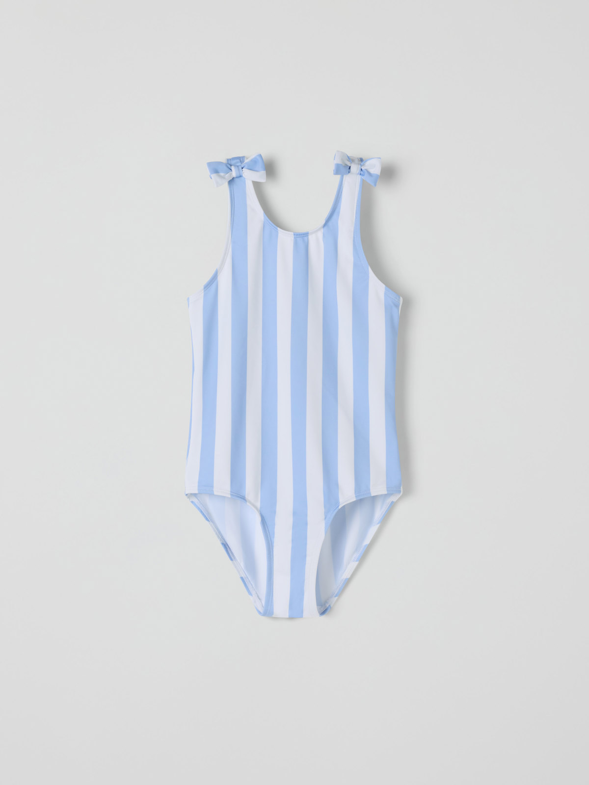Stripete badedrakt i mykt og behagelig materiale av resirkulert polyester. Badedrakten har et stort kirsebærmotiv foran og dekorative knuter på skulderstroppene. Den har fôret skritt og er sydd med ekstra myke sømmer som ikke gnager.