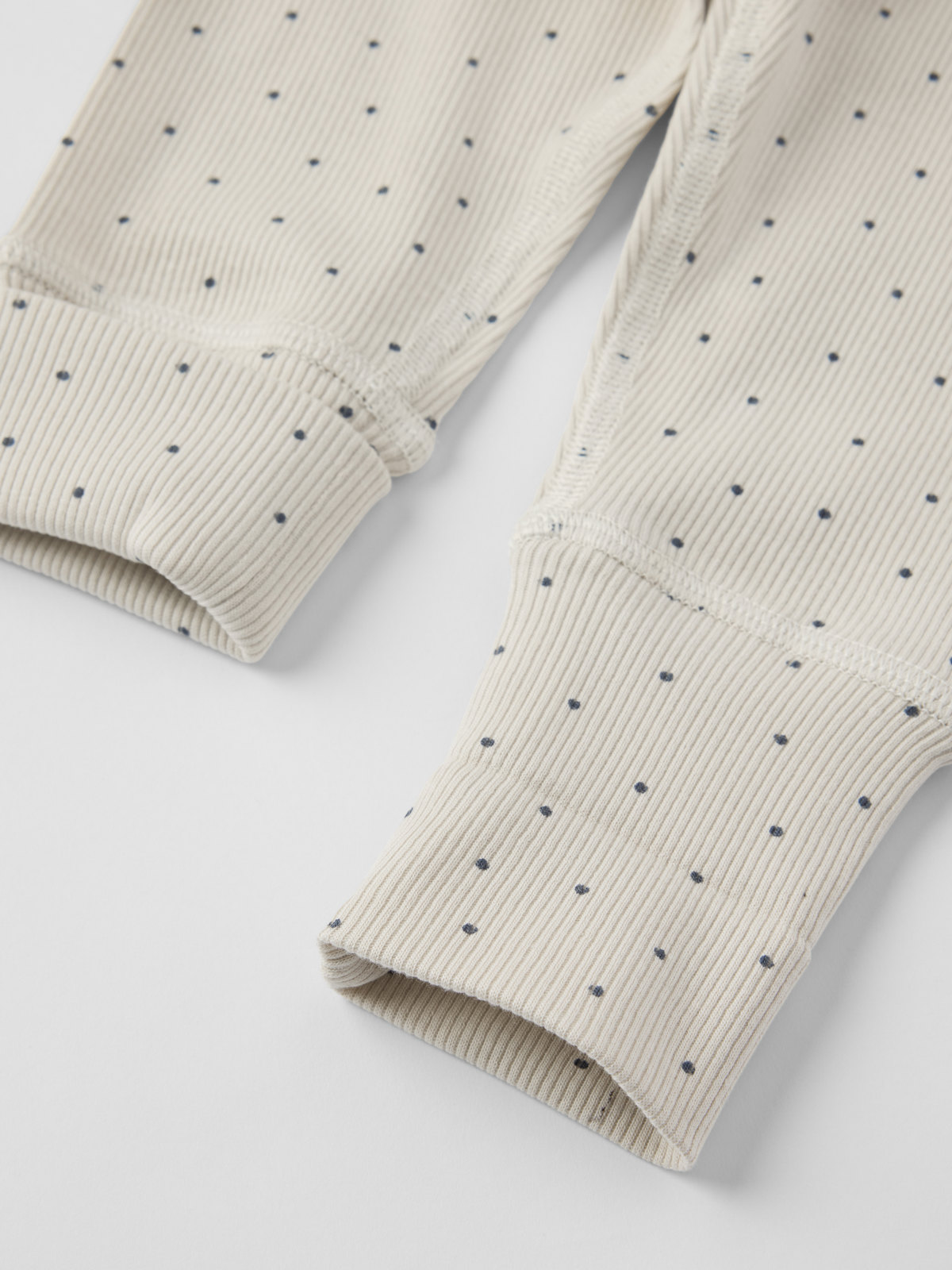 Ribbestrikket bukse i myk blanding av Tencel™ lyocell og økologisk bomull. Materialblandingen føles sval, behagelig og skånsom mot sensitiv hud. Buksen har lange nedbrettbare mansjetter nederst på bena for en god passform. Midjen kan justeres med knapphullstrikk.