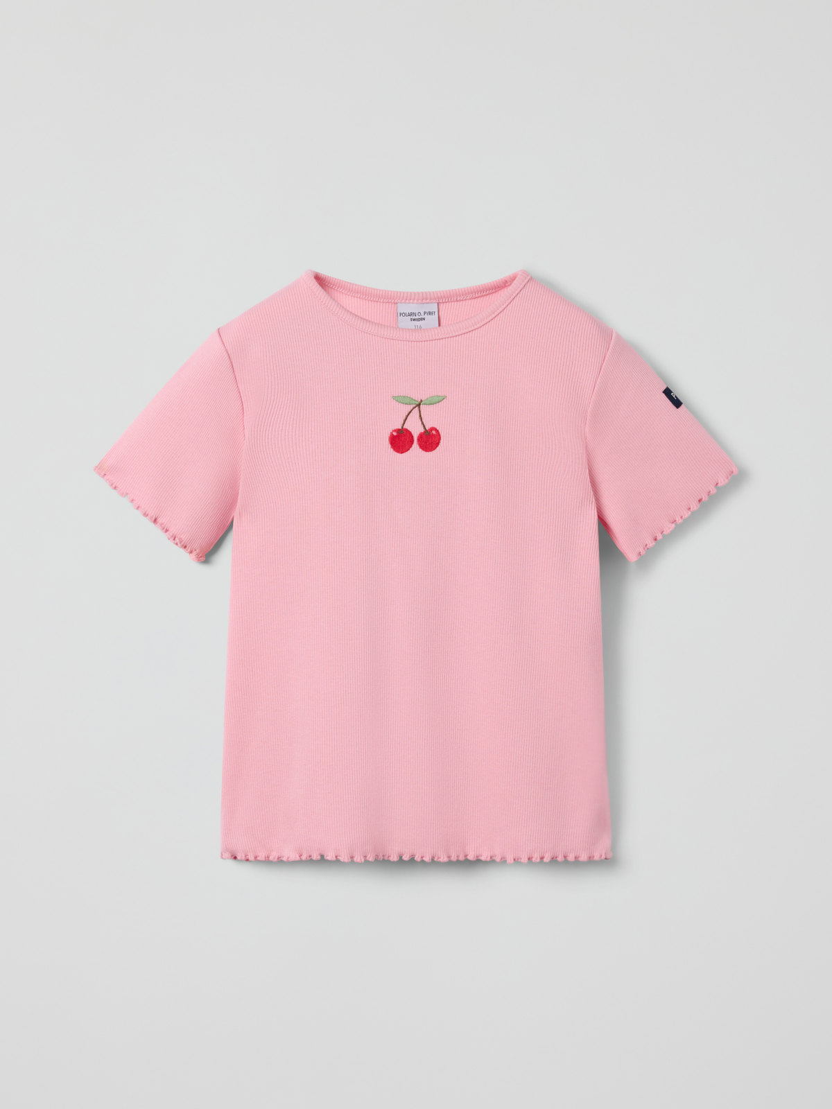 Ribbestrikket t-skjorte i myk blanding av Tencel™ lyocell og økologisk bomull. Materialet er svalende, behagelig og skånsomt mot sensitiv hud. T-skjorten har søt bølgekant på ermer og nederst, samt et lite brodert kirsebær foran.