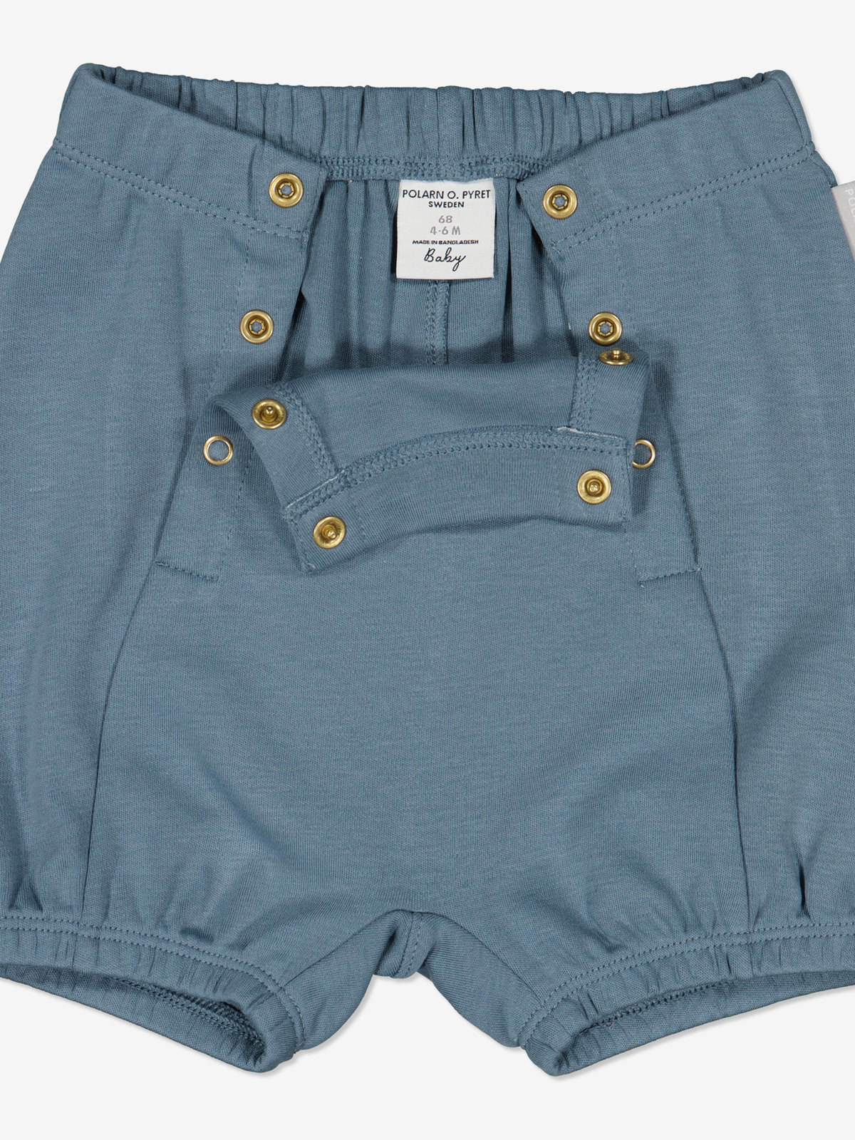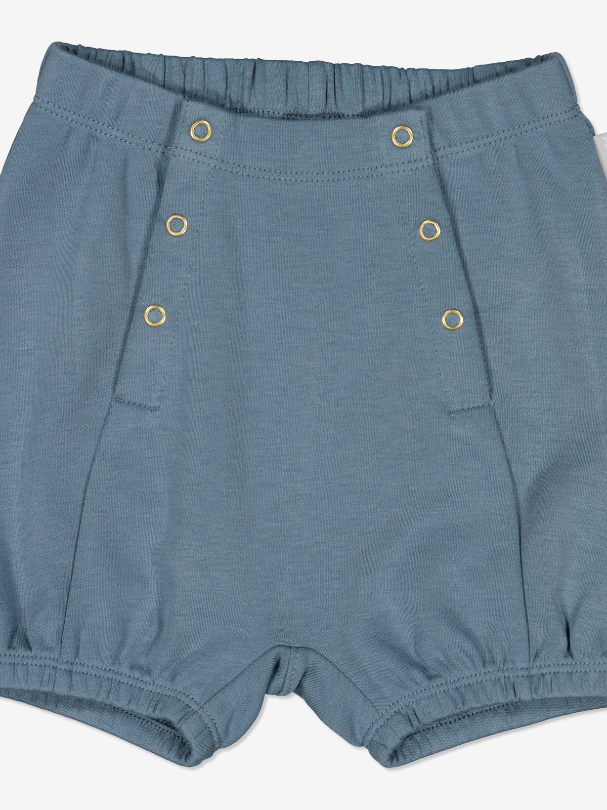 Ensfarget shorts i 100 % økologisk bomull til baby. Plagget har myk strikk i midjen og nederst på bena. Midjen har dessuten en skråstilt knappåpning foran på hver side.