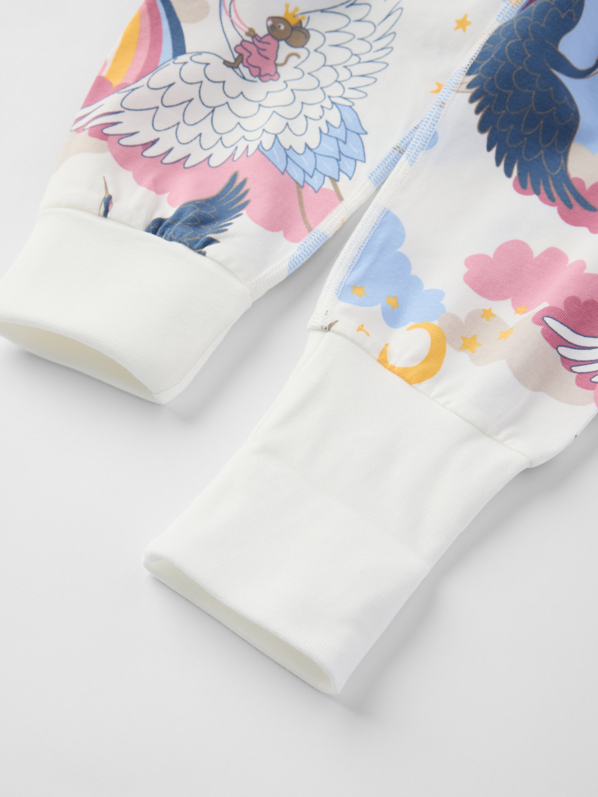 Todelt pyjamas i myk økologisk bomull. Overdelen har ekstra lang vrangbord nederst på ermene, som kan brettes opp eller ned. Buksen har elastisk midje og ekstra lang vrangbord nederst på bena.