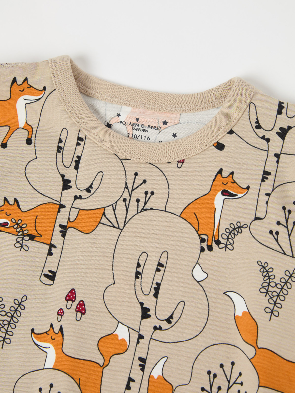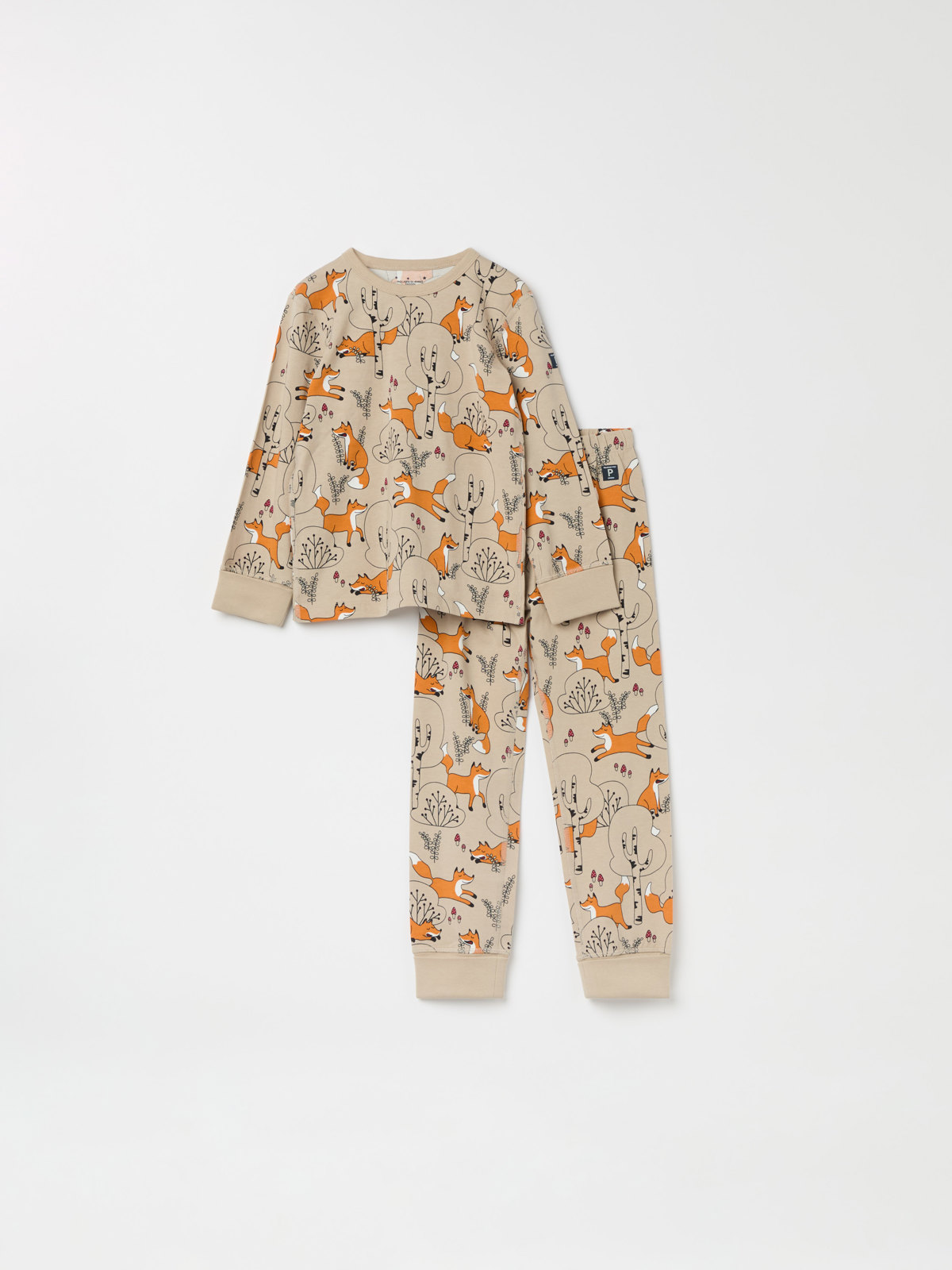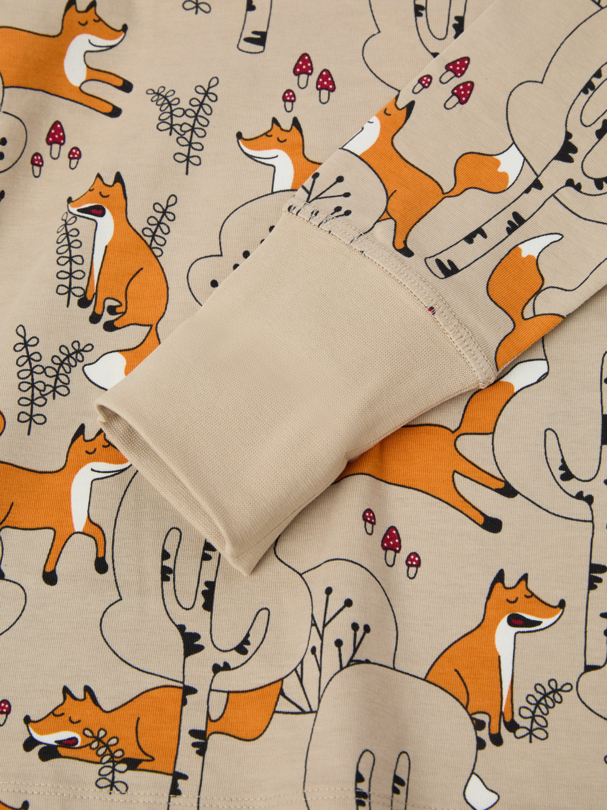 Todelt pyjamas i myk økologisk bomull, helmønstret med rever. Overdelen har ekstra lang vrangbord nederst på ermene, som kan brettes opp eller ned. Buksen har elastisk midje og ekstra lang vrangbord nederst på bena.