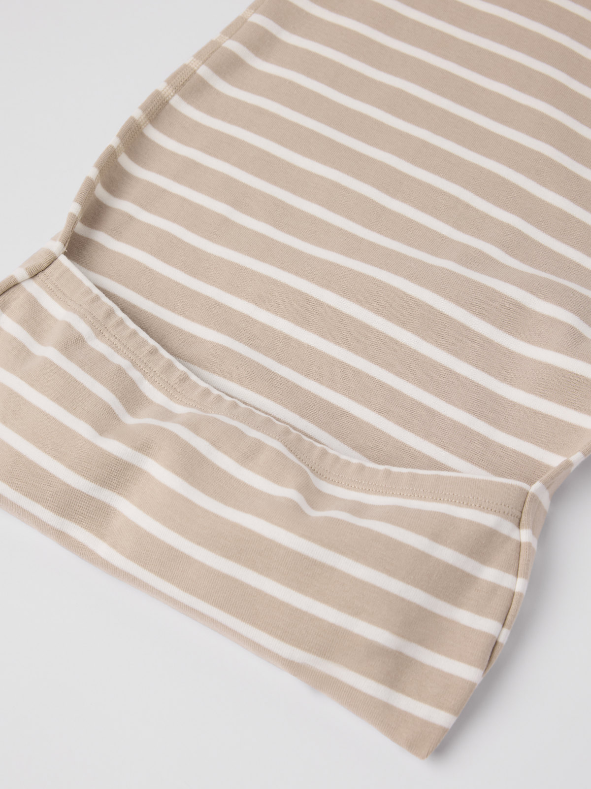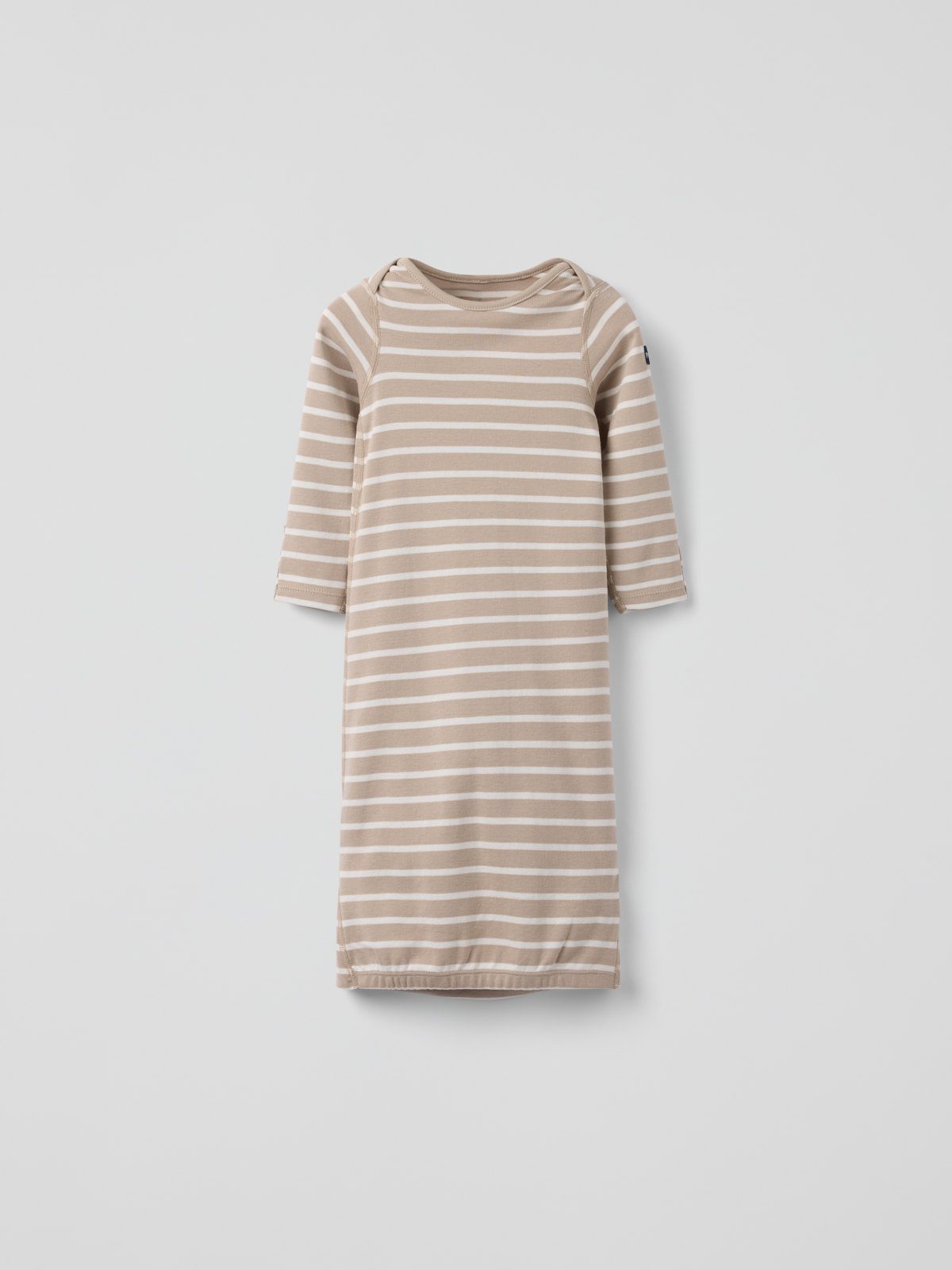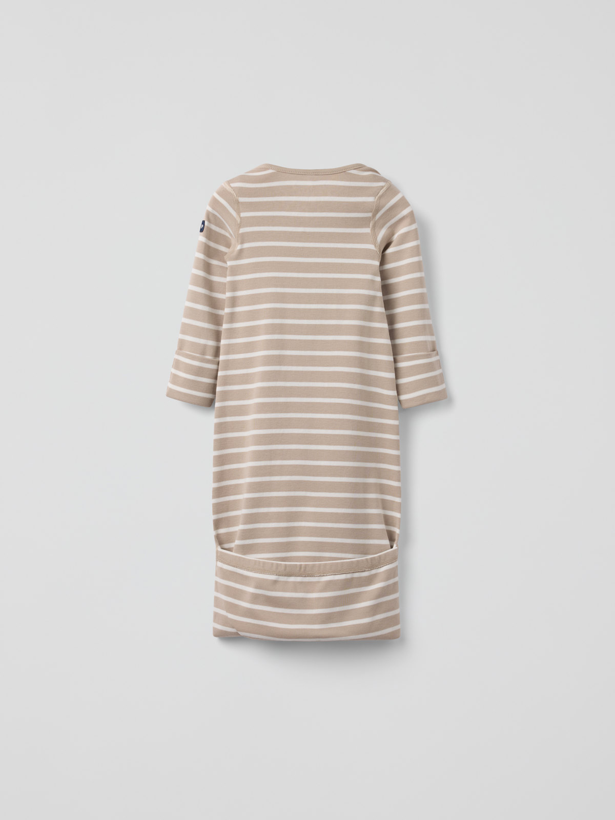 Stripet sovepose i tynn bomullsjersey – koselig både i vogn og seng! Soveposen har lange ermer og omslagslagte skuldre for enkel på- og avkledning. Den er sydd med ekstra myke sømmer som ikke irriterer sensitiv hud. Soveposen har strikk i nederkanten.