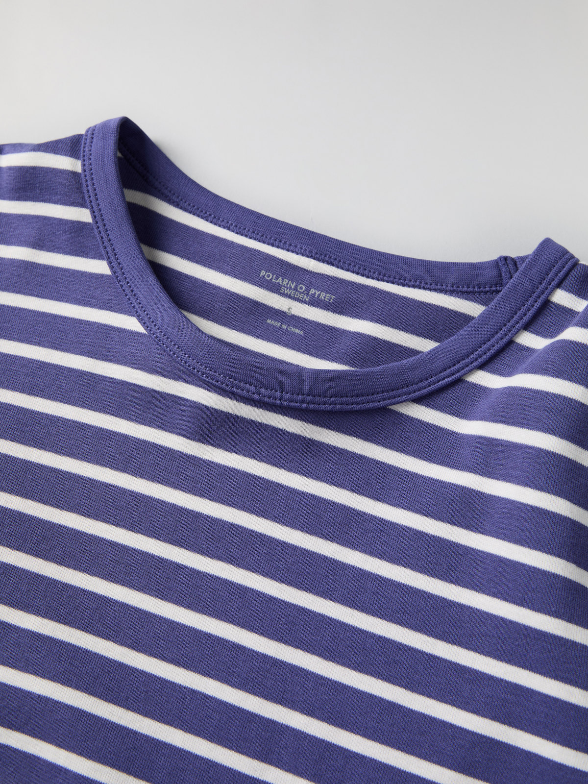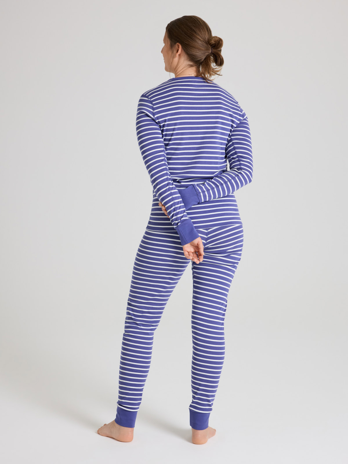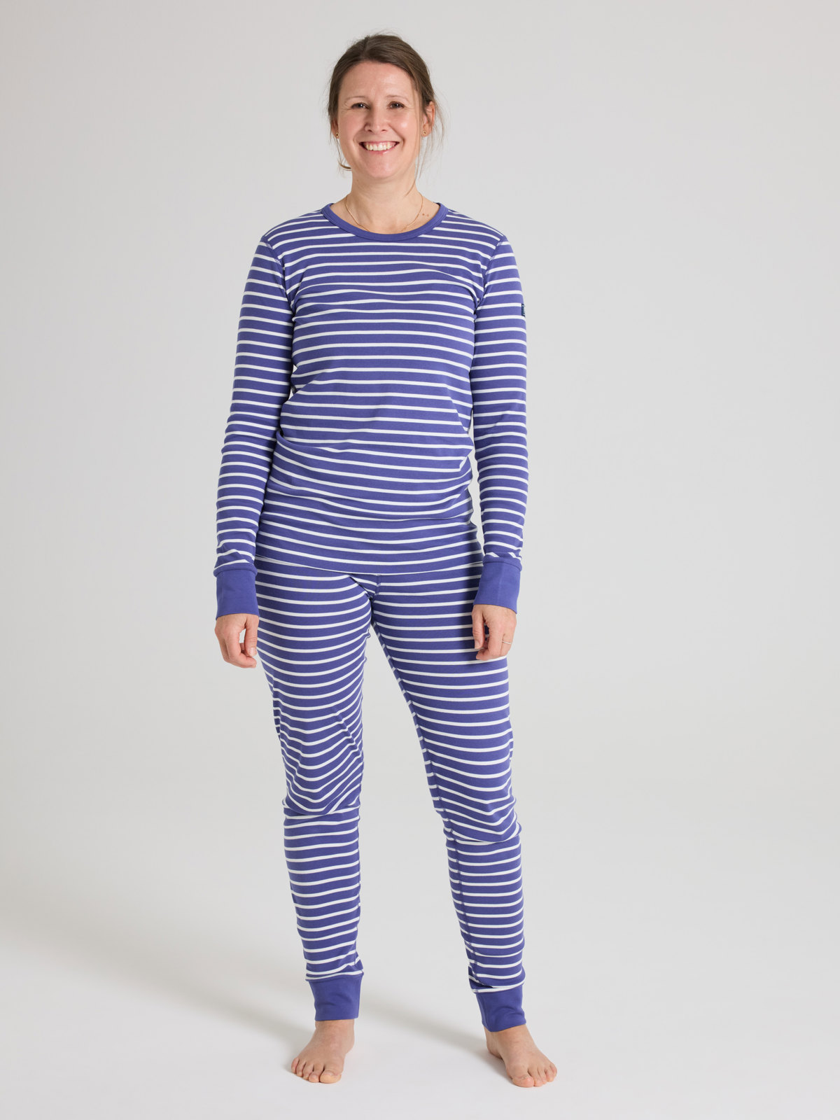 Sett med overdel og bukse i våre klassiske striper til voksen. Overdelen har myk, ribbestrikket vrangbord rundt halsutringningen og nederst på ermene. Buksen har elastisk midje og myk ribbestrikket vrangbord nederst på bena.