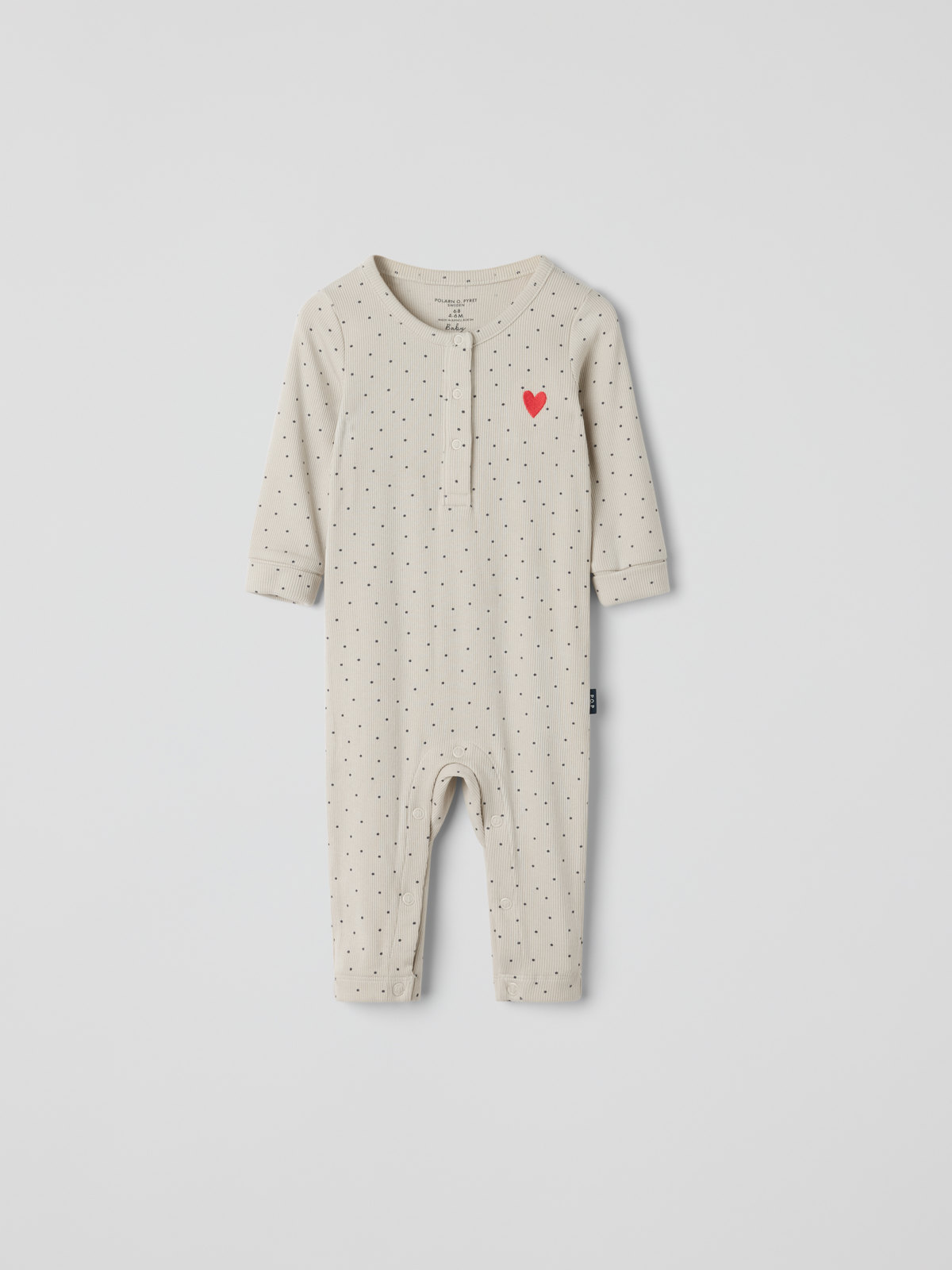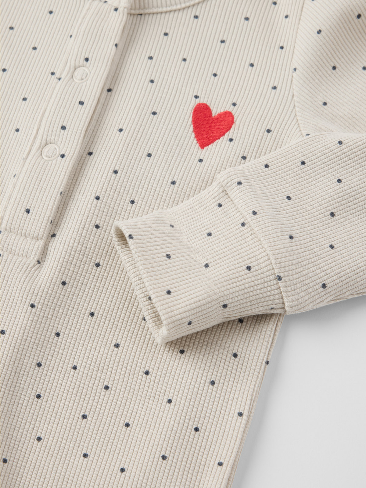 Ribbet heldress i myk blanding av Tencel™ lyocell og økologisk bomull. Materialet føles svalt, behagelig og skånsomt mot sensitiv hud. Heldressen har myke mansjetter i ermeavslutningen for god passform og kort knappestolpe foran. Den har også et lite brodert hjerte på brystet.