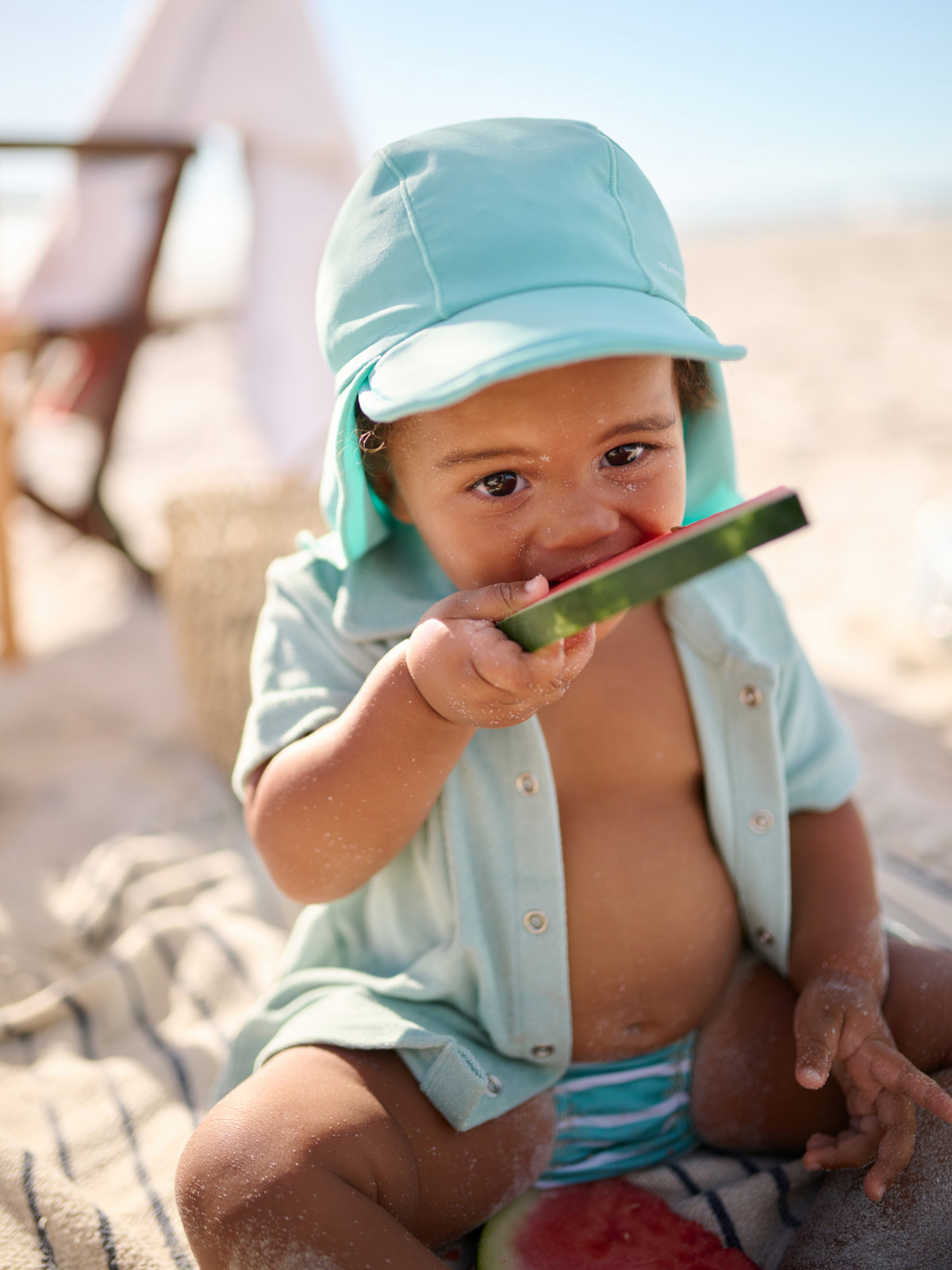 Skyggen foran og det brede stoffet bak beskytter både ansikt og nakke mot solen.