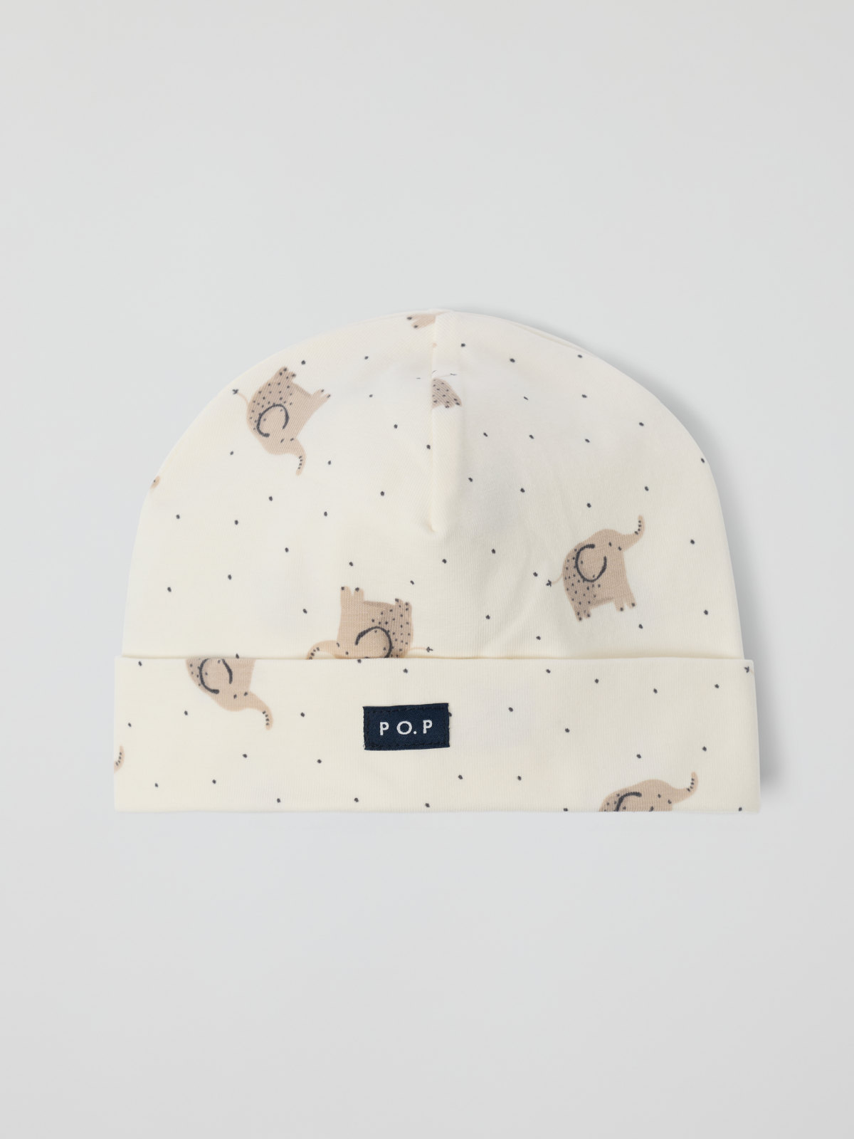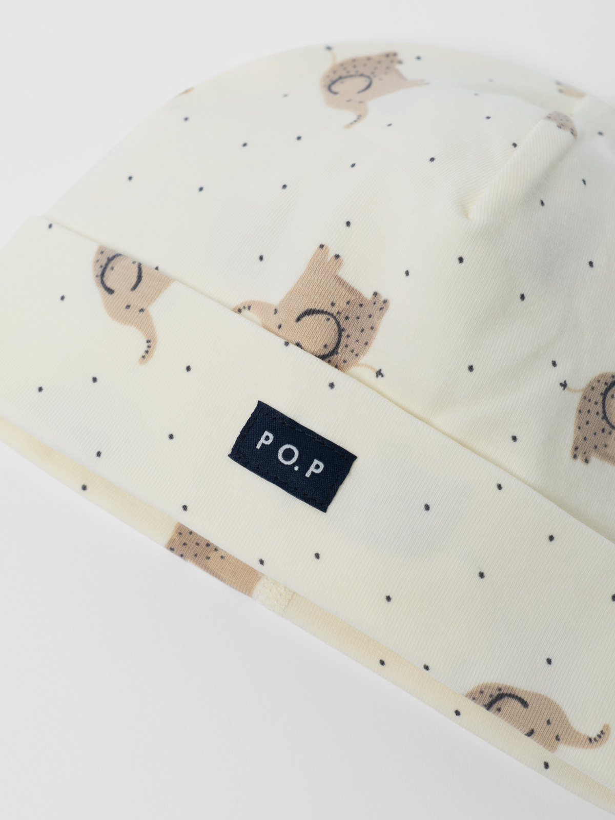 Supermyk lue i økologisk bomullsjersey – perfekt for de aller minste. Luens heldekkende elefantmønster og ekstra myke sømmer gjør den skånsom mot sensitiv hud.