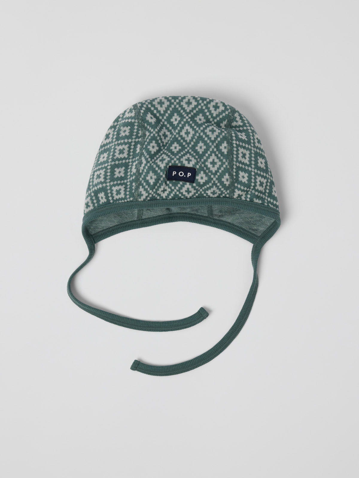 Jacquardmønstret hjelmlue i tynn og myk merinoull for de aller minste. Merinoull holder på varmen selv når den er fuktig, og bidrar til å regulere kroppstemperaturen – og er dessuten uslåelig myk mot huden. Knytebånd under haken holder luen på plass.
