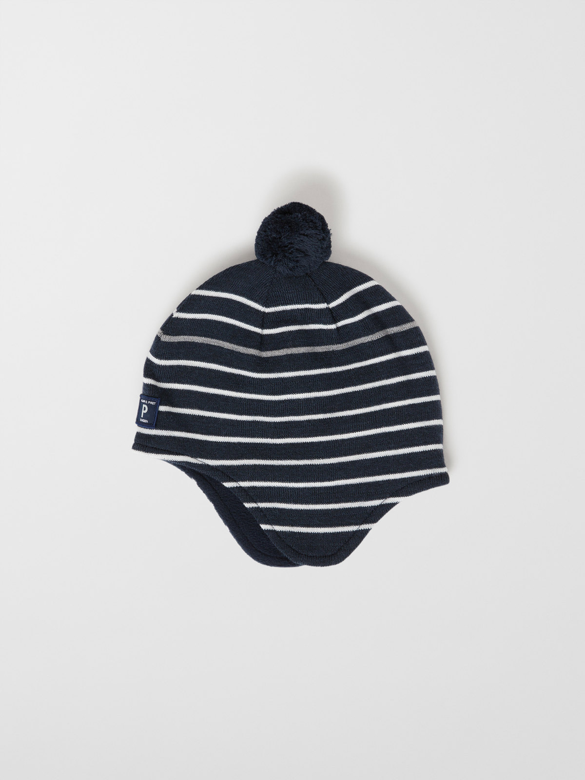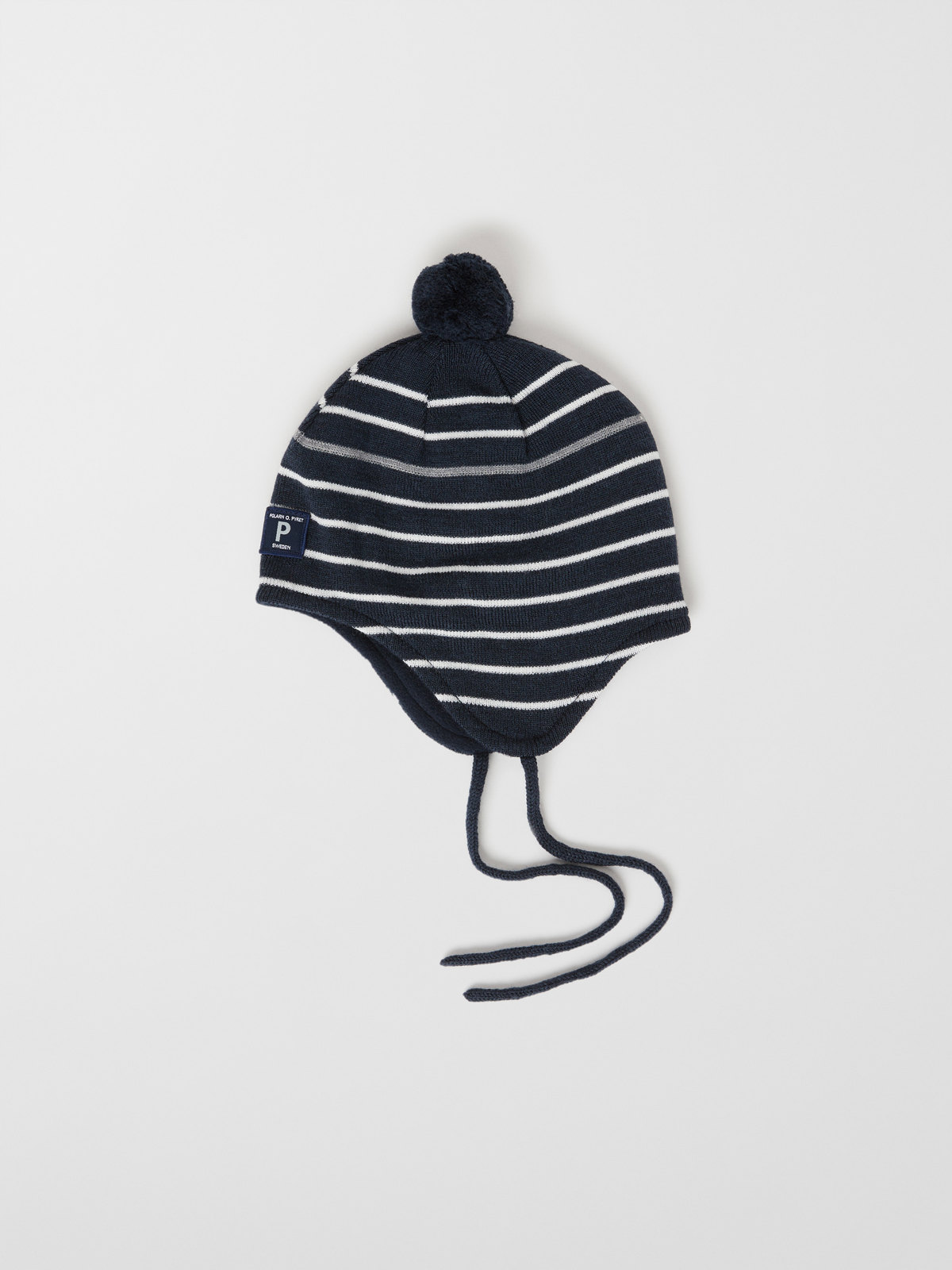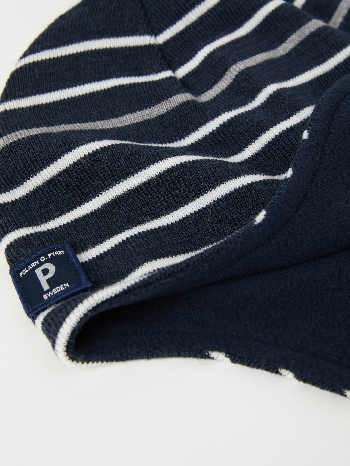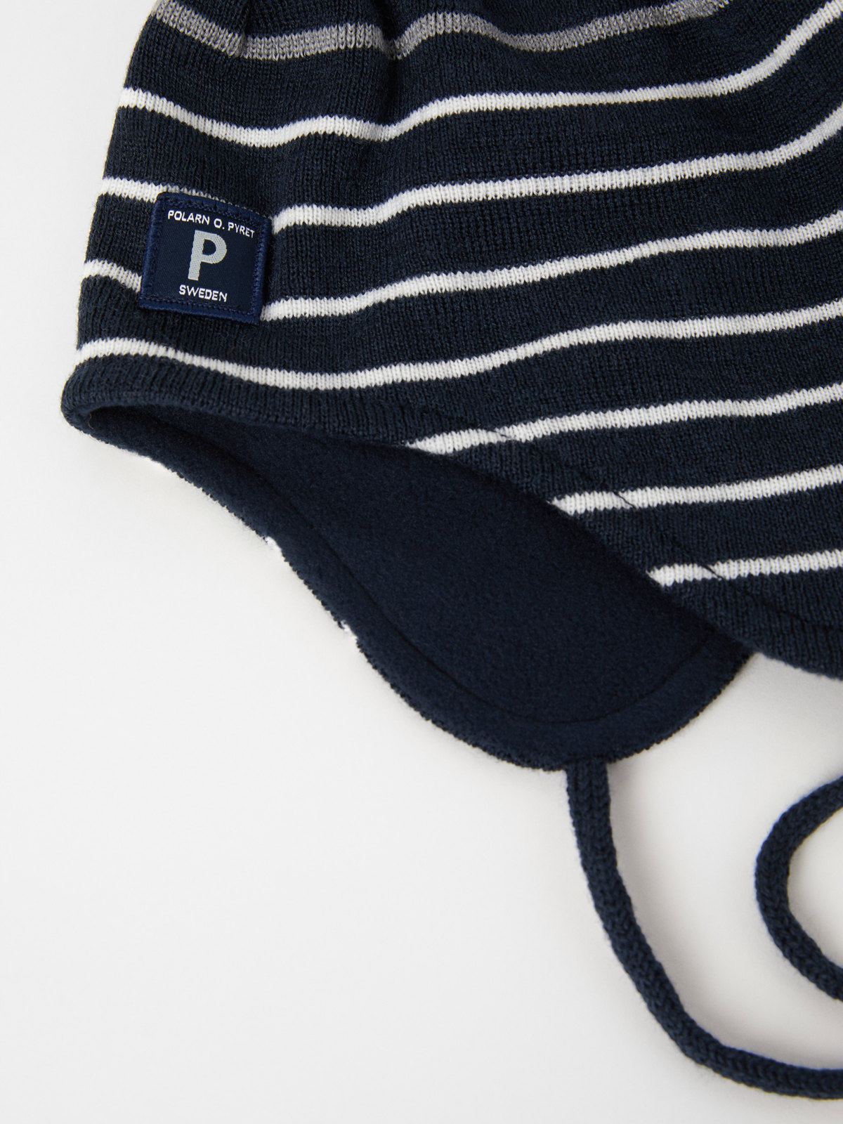 Stripet hjelmlue i varmende ullblanding. Luen er vindtett og går helt ned over ørene. Den har også et mykt fleecefôr og en refleksstripe som gjør den synlig i mørket. Knytebåndet under haken holder luen på plass. Størrelse 52/54 har ikke knytebånd. Ull holder på varmen selv når den er våt.
