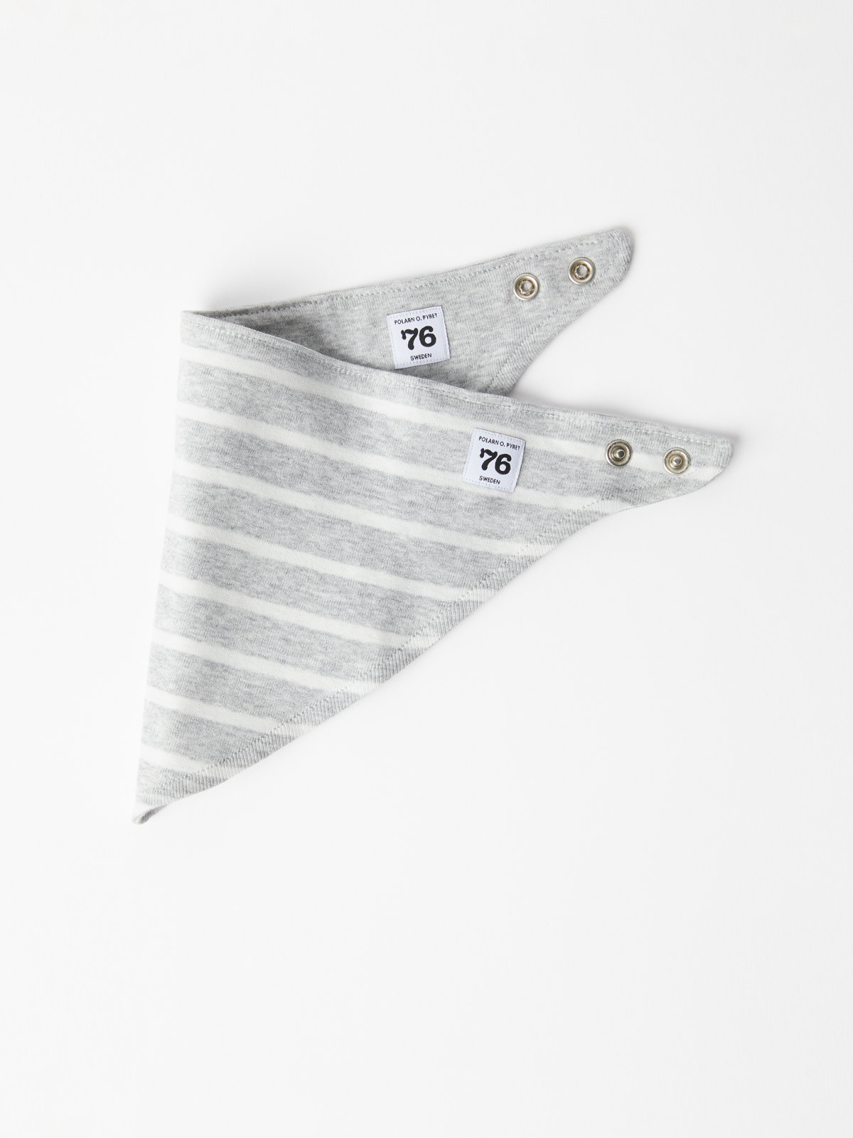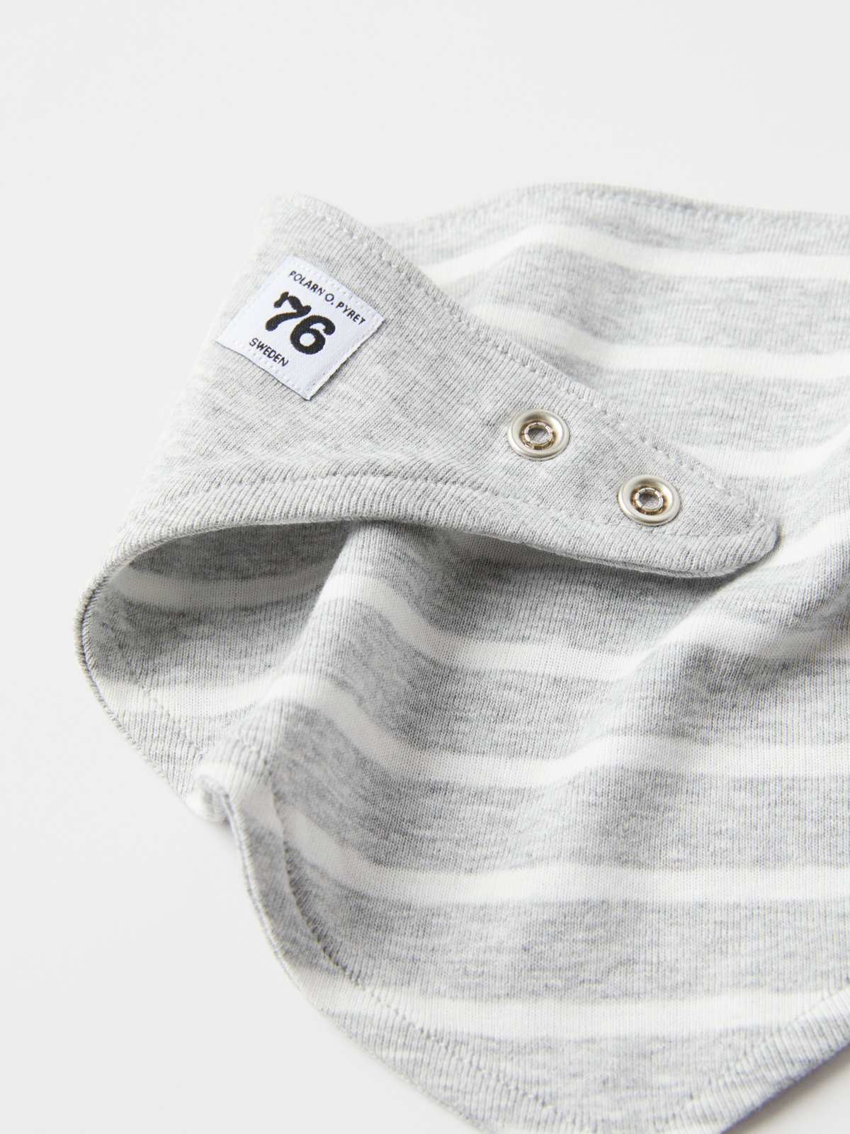 Vendbar smekke i myk trikot til baby. Smekken beskytter klærne og er fremstilt i 100 % økologisk bomull. Den ene siden har våre klassiske striper og den andre siden er ensfarget. Størrelsen i nakken kan reguleres med trykknapper.
