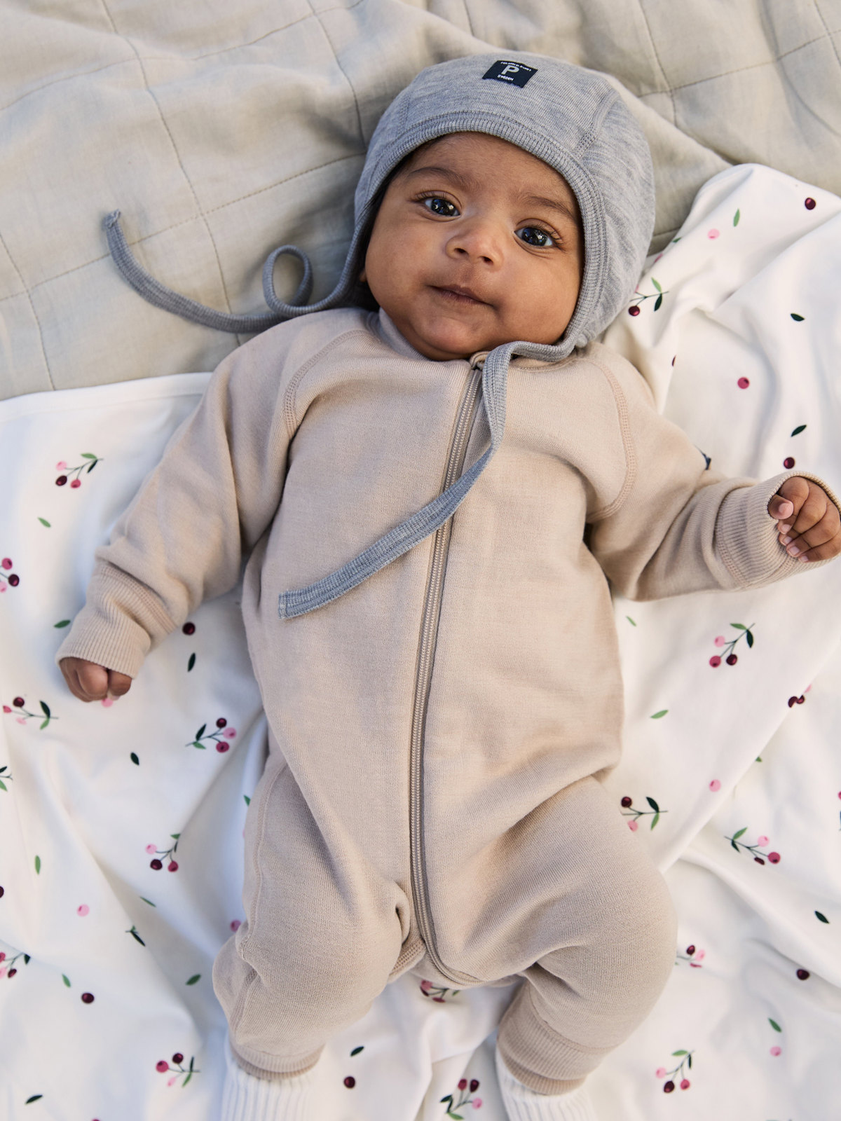 Varm dress i myk og deilig merinoull-frotté som absorberer fuktighet effektivt og holder barnet varmt og tørt.