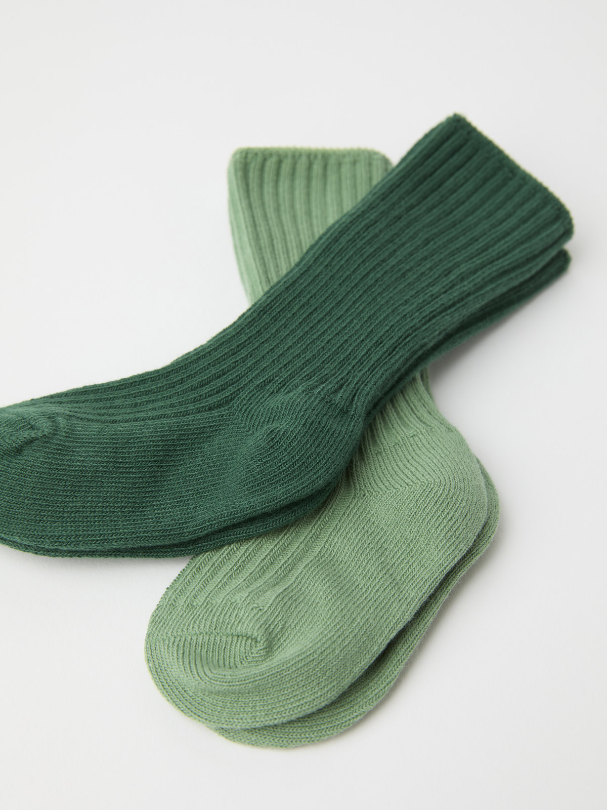 Fyll på sokkeskuffen med to par ensfargede sokker i myk økologisk bomull til baby. Sokkene har myk vrangbord som kan brettes ned og som ikke gnager.