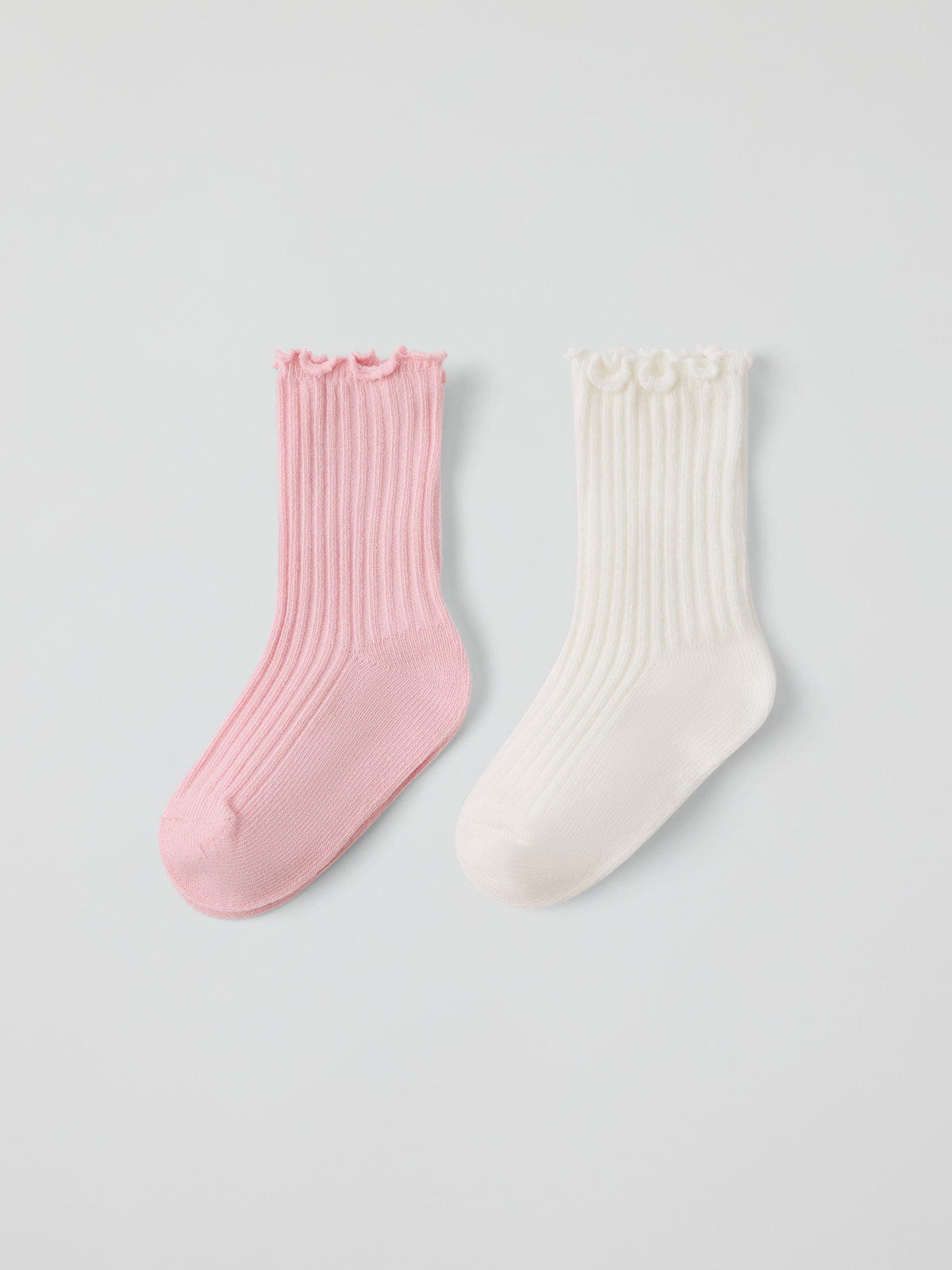2-pakning myke sokker i økologisk bomull til baby med fin volangkant. Sokkerne har lang, nedbrettbar kant og passer perfekt til resten av babykolleksjonen vår.