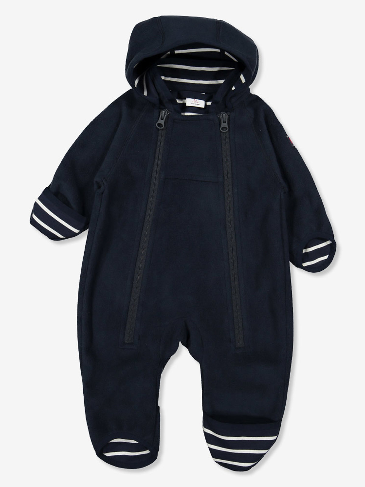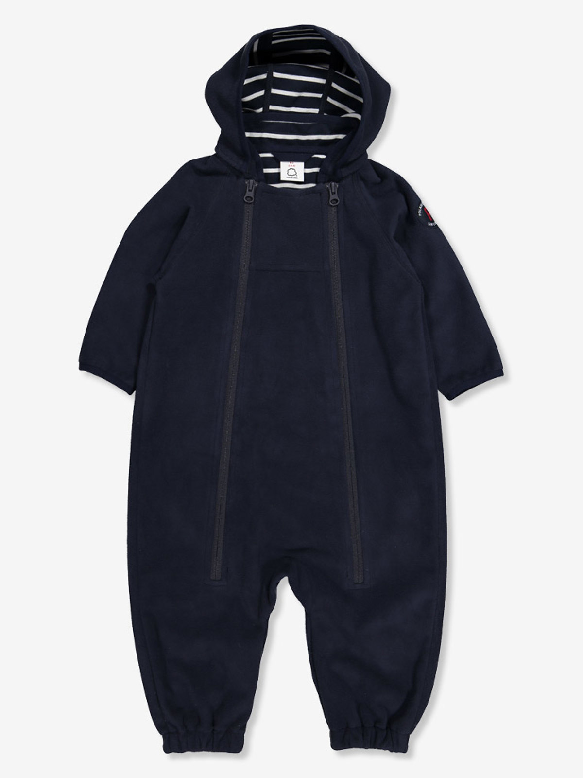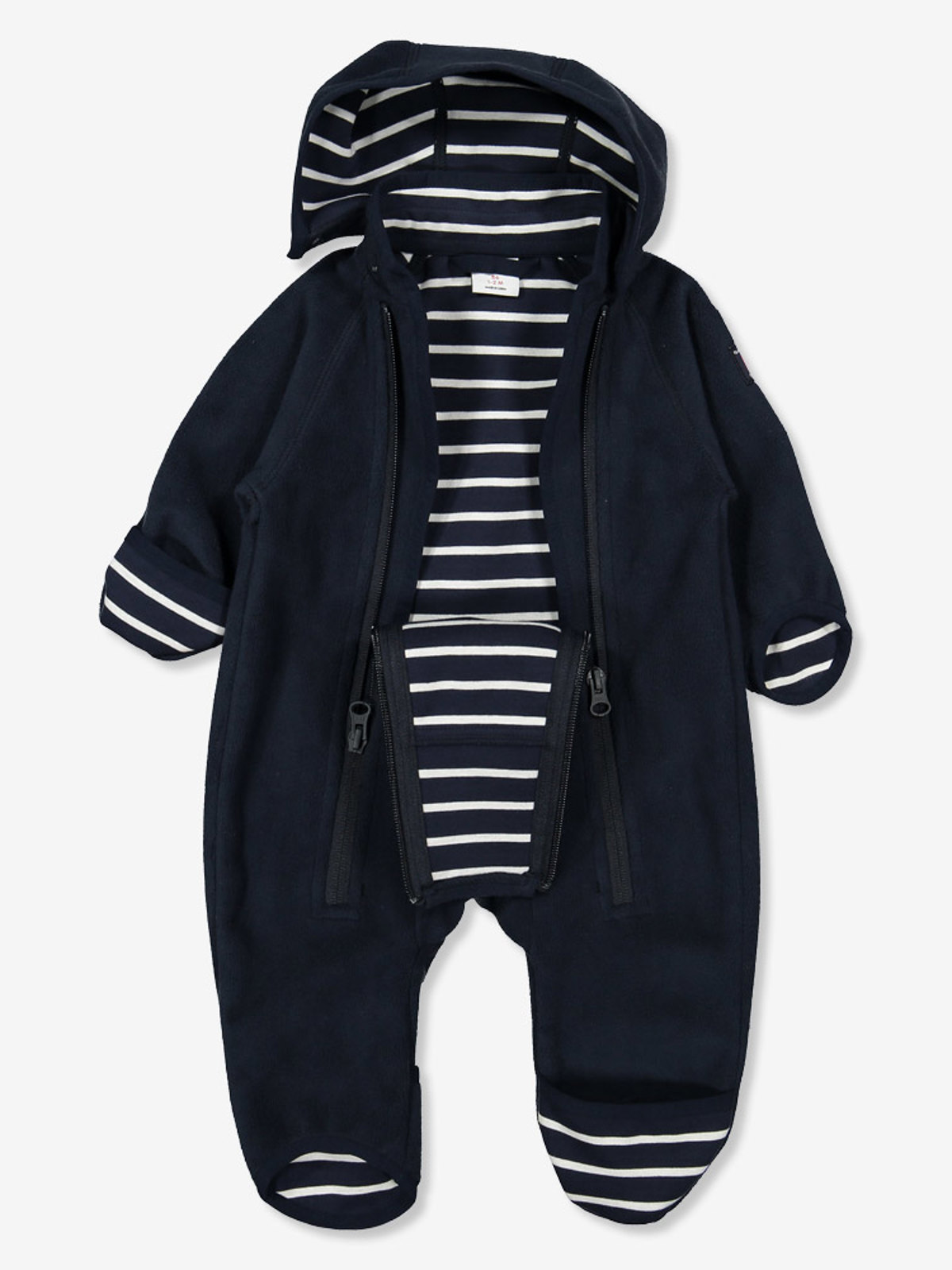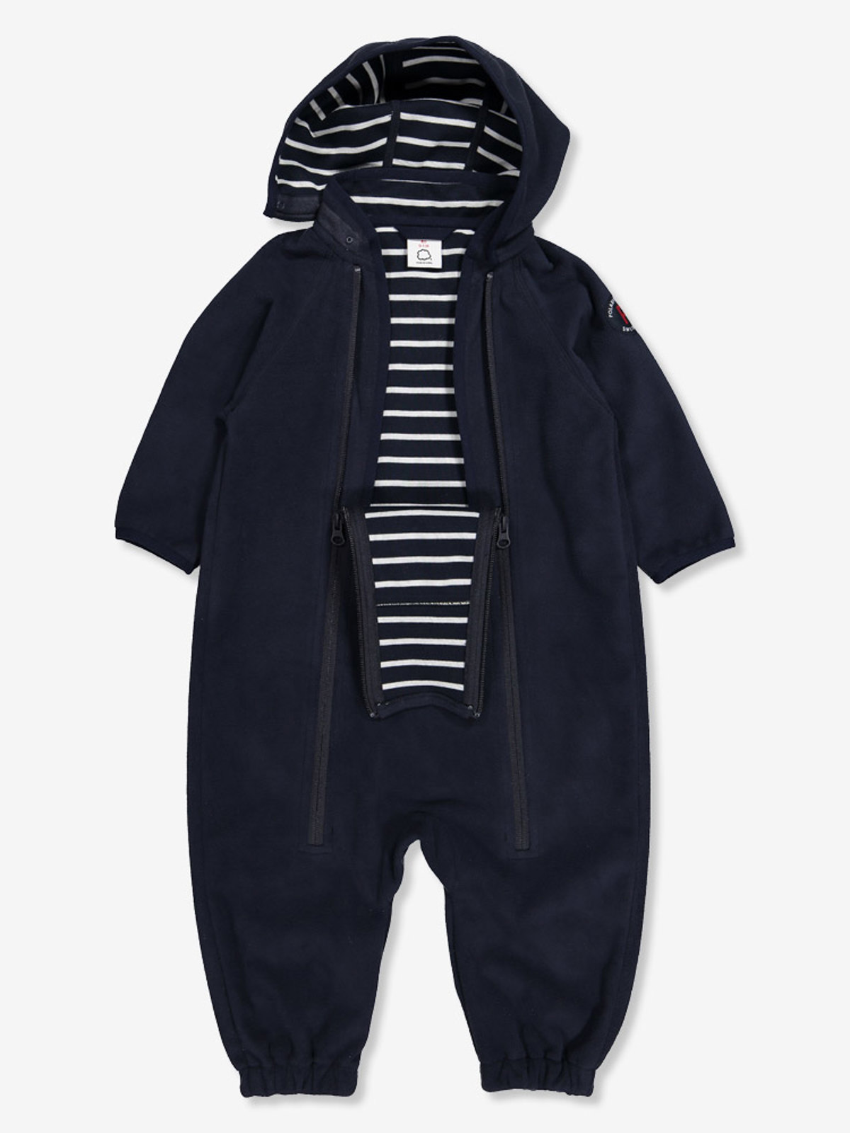 Vindfleecedress til baby i vind- og vanntett materiale med god pusteevne, egner seg ypperlig i barnevognen. Dressen er fremstilt i resirkulert polyester og fôret med myk trikot i våre klassiske striper. Hetten er avtakbar og festes med trykknapper. De doble glidelåsene foran forenkler klesskift og har en vindklaff på innsiden som beskytter ekstra mot kald luft samt en beskyttelse øverst for å hindre at glidelåsene gnager mot hake og kinn. I tillegg er dressen avrundet nederst på ermer og ben med overlappende stoff som holder små hender og føtter varme. Størrelse 80 har ikke overlappende stoff nederst på ermene og bena, og størrelse 50-74 har fast hette. Lag 3 – ytterlaget holder på varmen og beskytter mot all slags vær. • Vindtett • Vannavvisende materiale. Materialets vannsøyle er >3000 mm • God pusteevne • Avtakbar hette • Innvendig vindklaff • Avrundet nederst på ermer og ben • Overbrettbart stoff nederst på ermer og ben