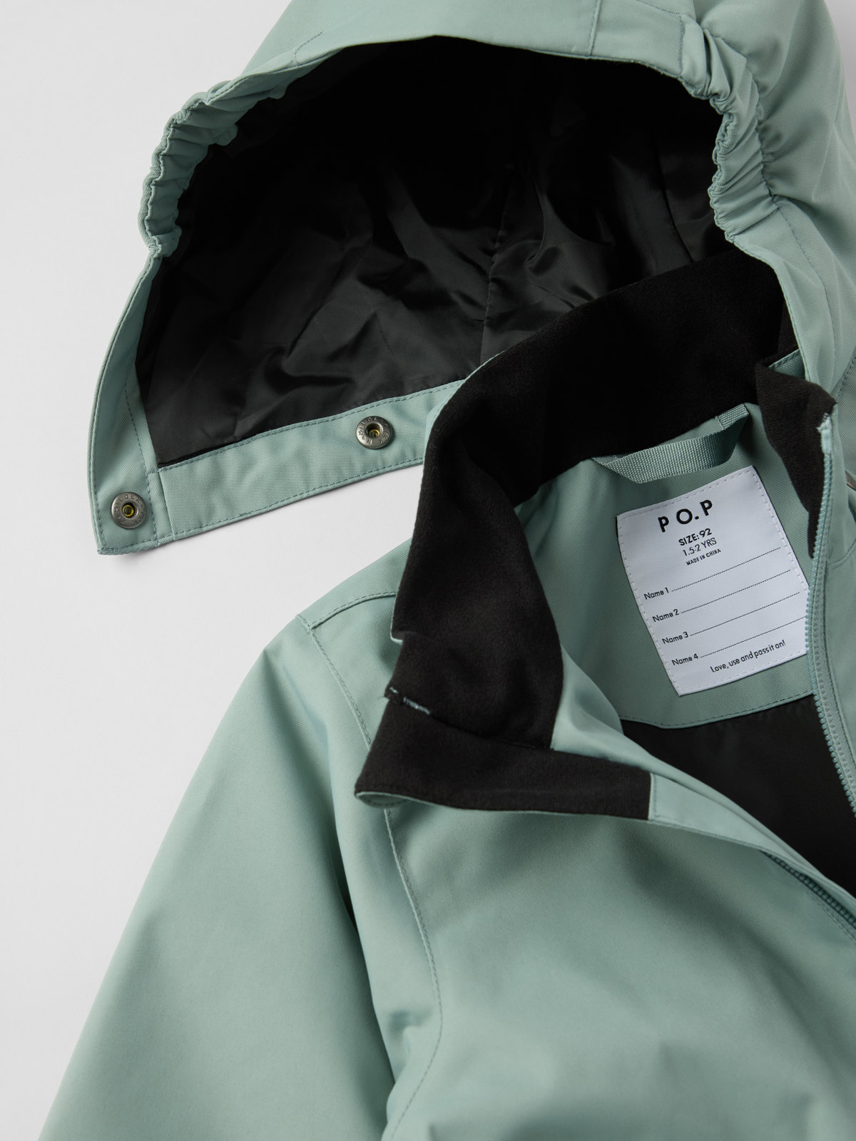 • Hetten er avtakbar og kan festes med trykknapper for økt sikkerhet, og har dessuten strikk i sidene for best mulig passform