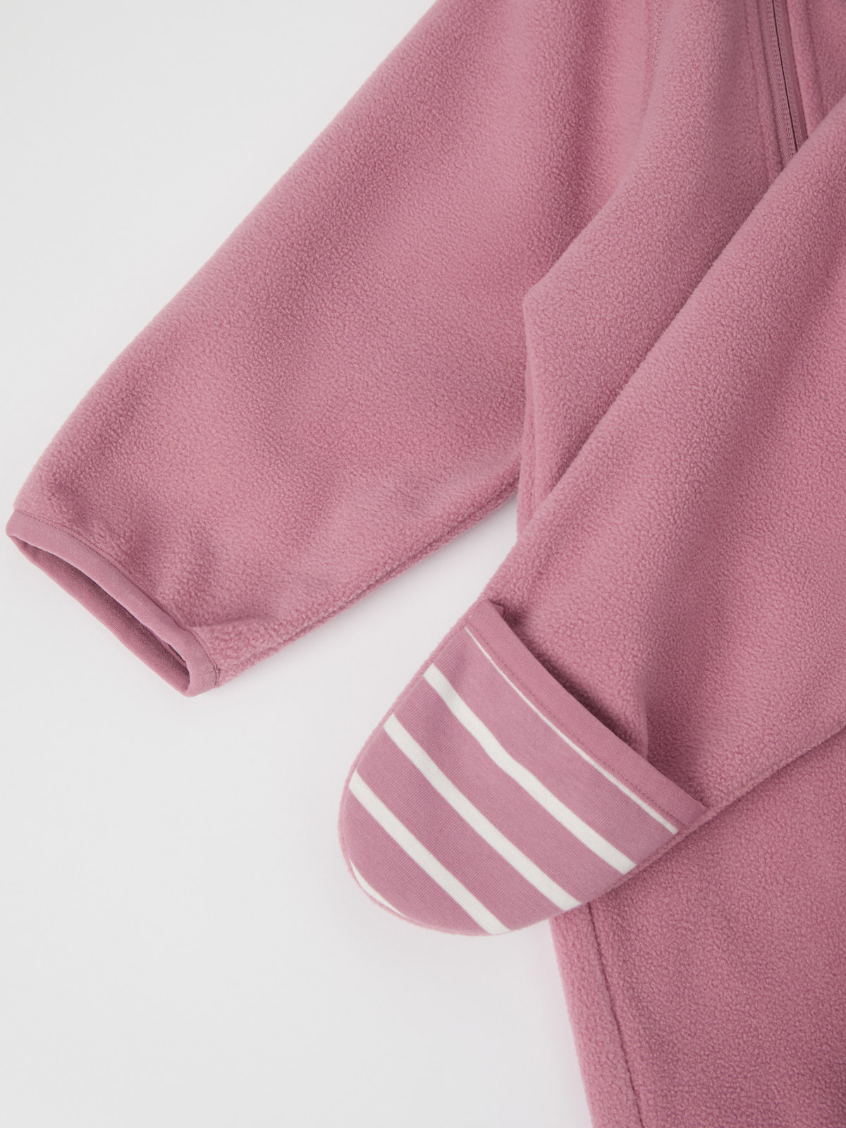 Dressen har dessuten stoff som kan brettes over nederst på ermer og ben for å holde små hender og føtter behagelig varme.