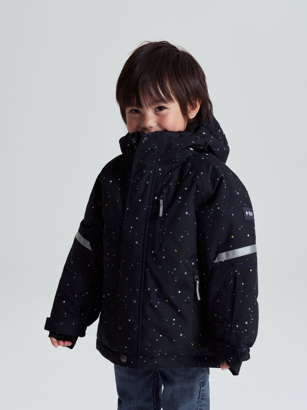 Vattert, vind- og vanntett vinterjakke SNOWY – perfekt for fart og lek i snø og kulde! SNOWY er vår mest slitesterke og fleksible vinterkolleksjon – laget for aktive dager i skiftende vintervær. Jakken har lett og varm Primaloft-vattering og god pusteevne. Mansjettene er utstyrt med myk ribbekant med tommelhull. Snølås nederst hindrer snø i å komme inn.