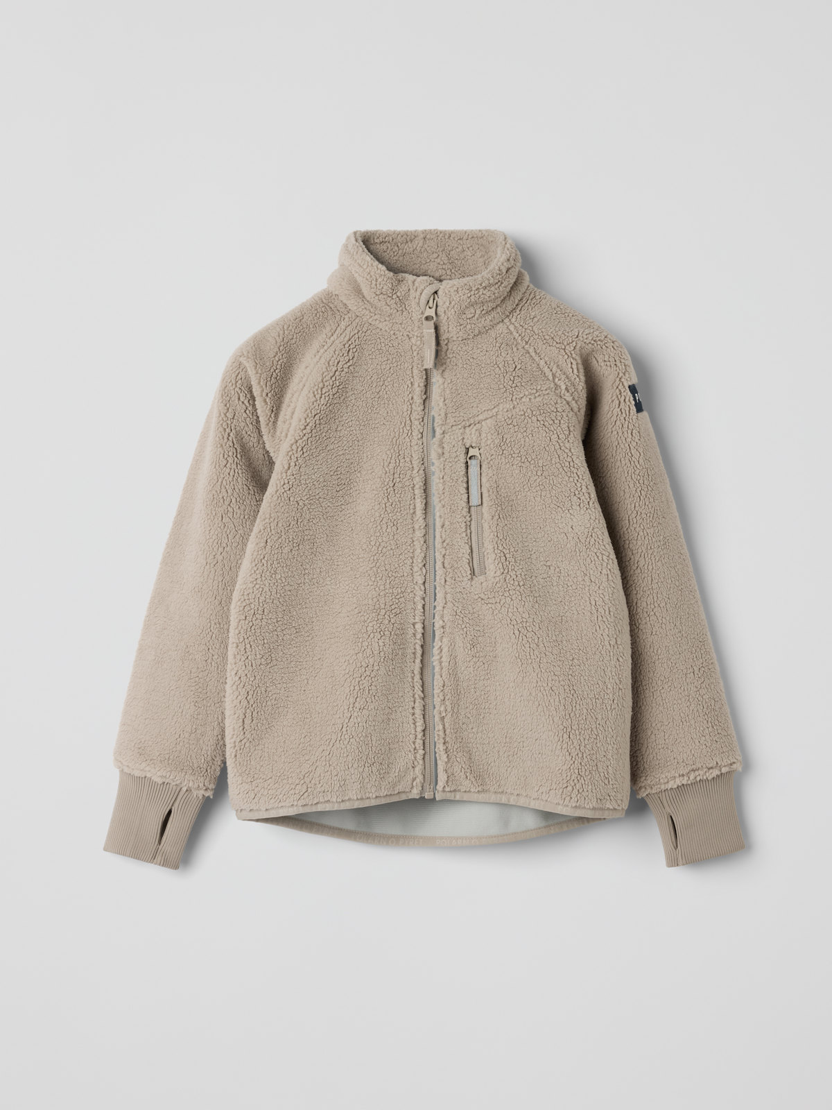 Myk og behagelig pilefleecejakke i vindtett materiale av resirkulert polyester med god pusteevne. En allsidig jakke som holder barnet ditt varmt og tørt på vårens og høstens kjølige dager.