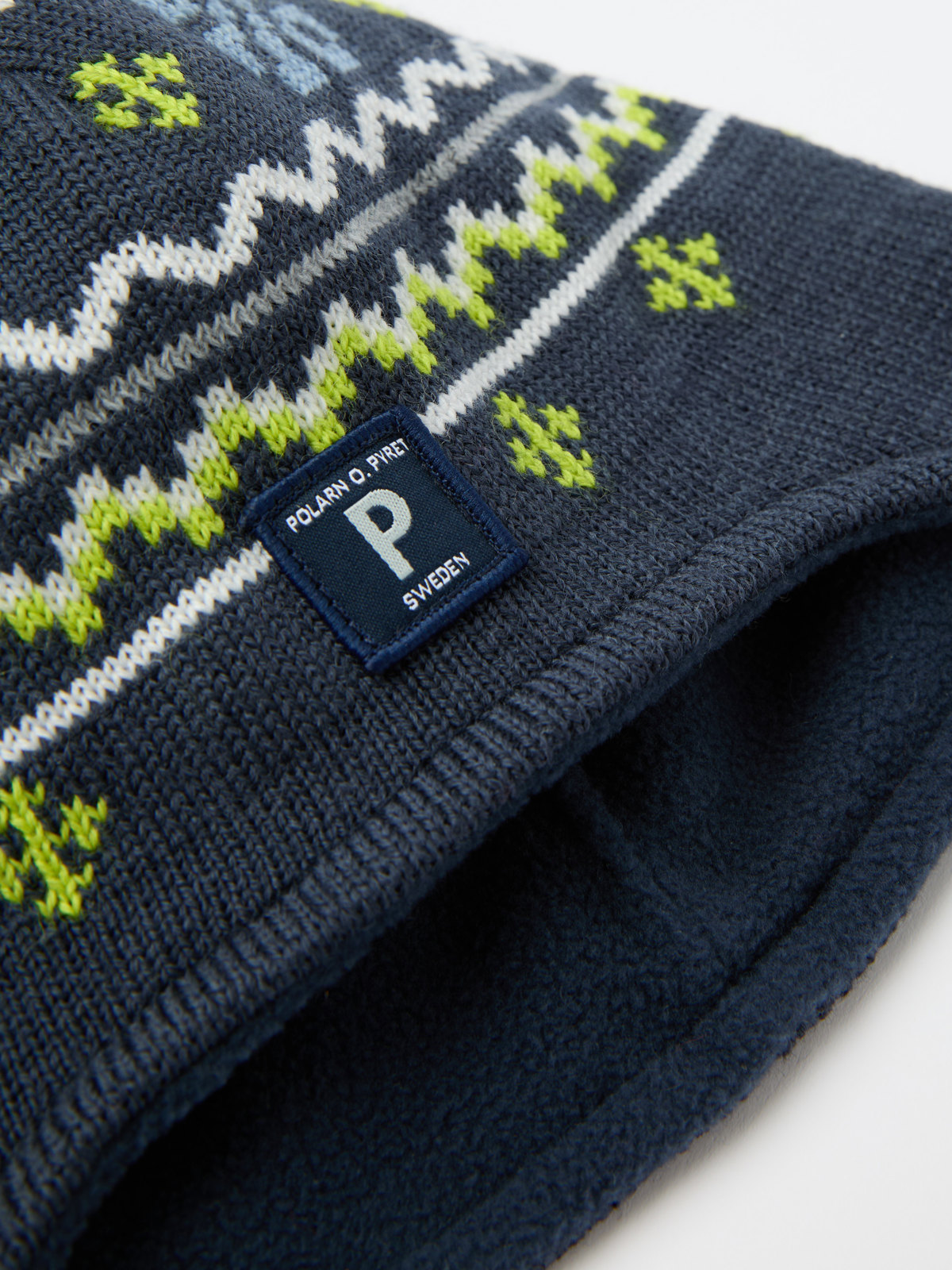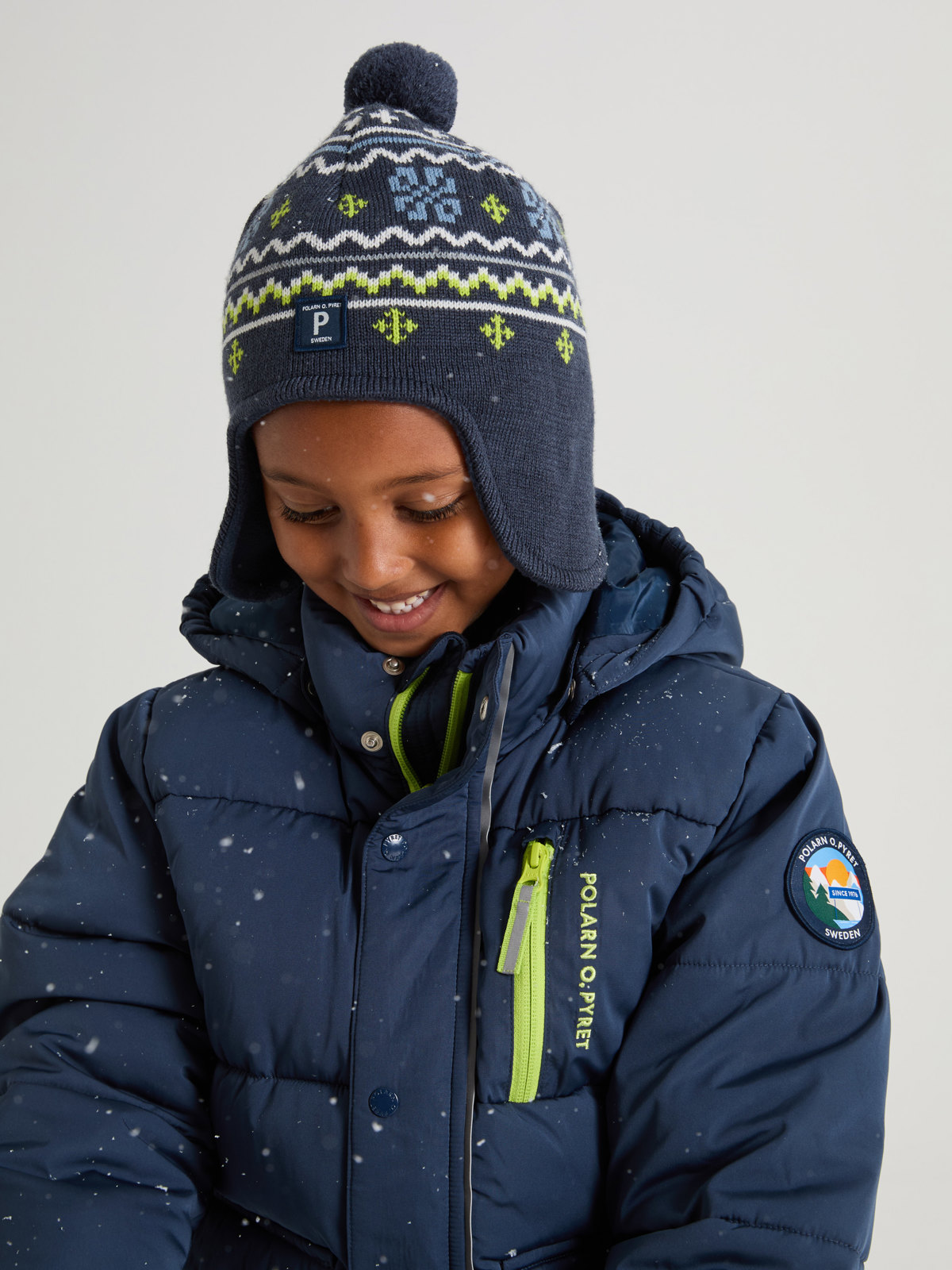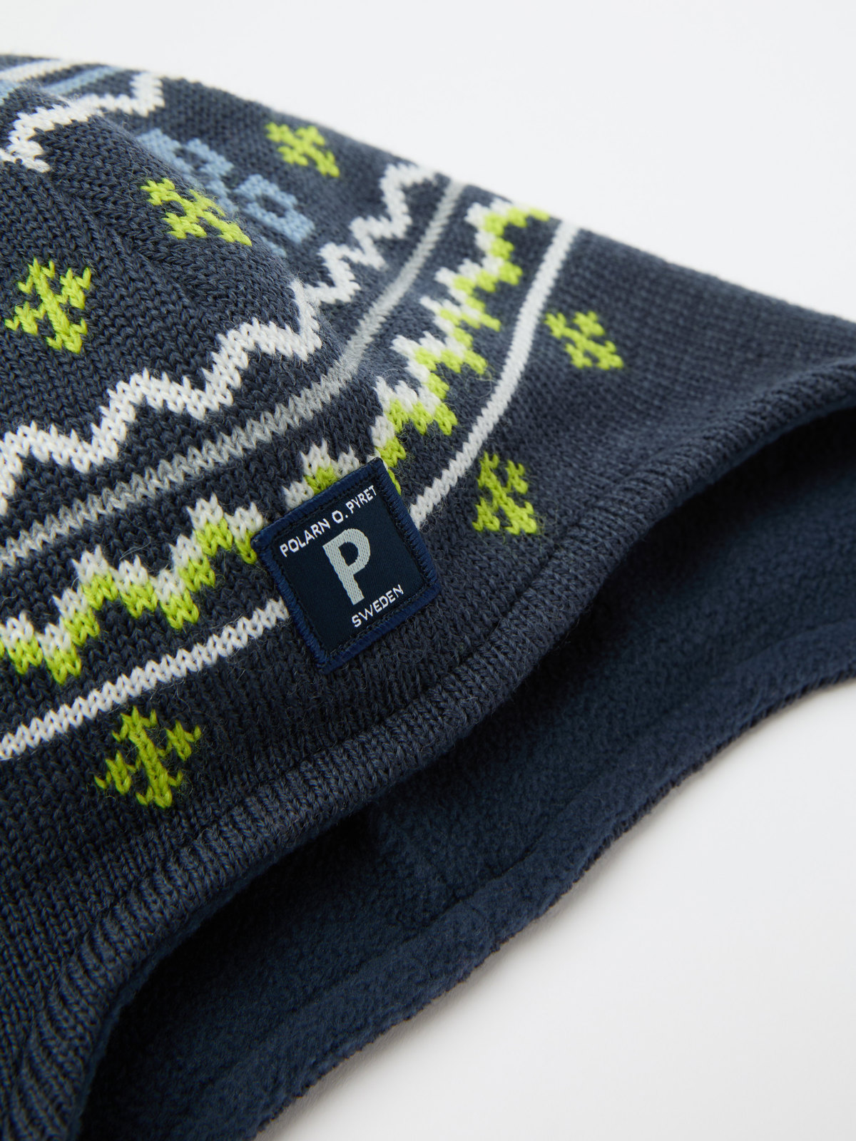 Vindtett, jacquardmønstret hjelmlue i varmende ullblanding, med fin dusk. Luen er fôret med myk fleece.