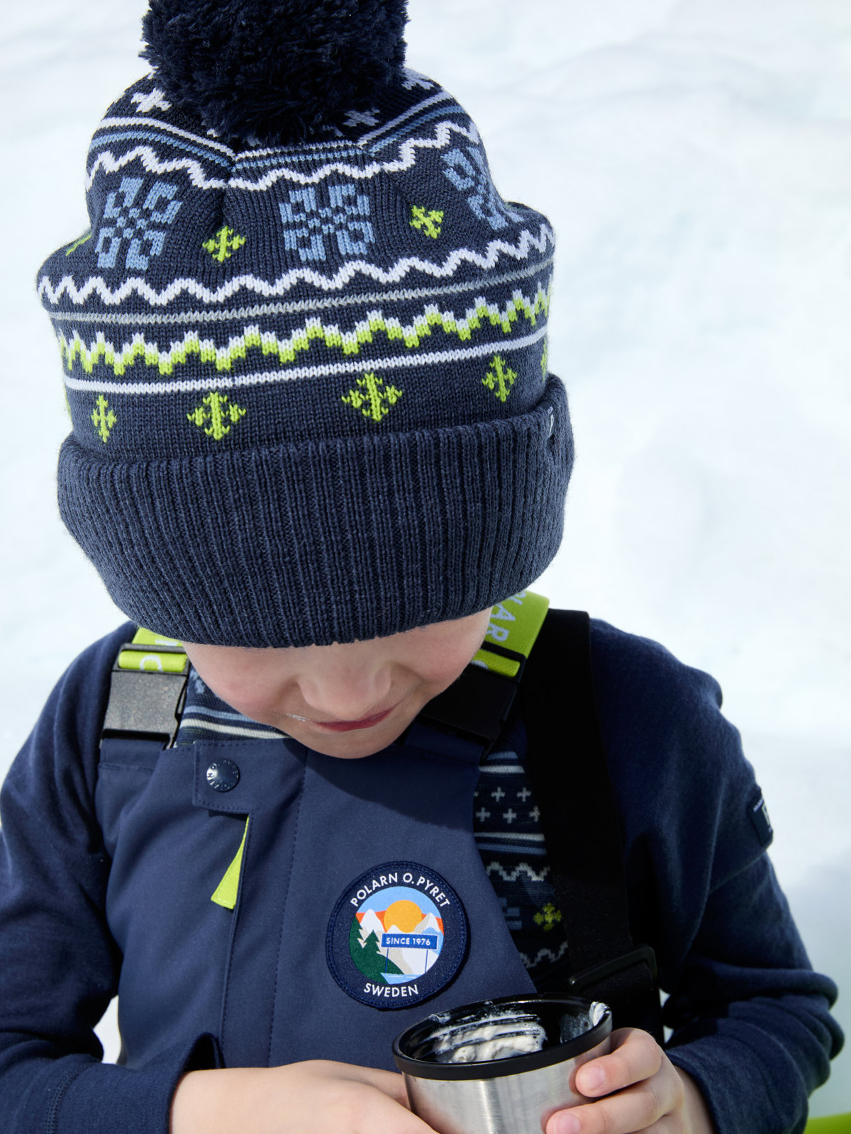 Strikket, jacquardmønstret lue i varmende ullblanding, med fin dusk. Luen er vindtett og har et mykt, varmende fleecefôr samt en fin oppbrett som varmer ørene litt ekstra.