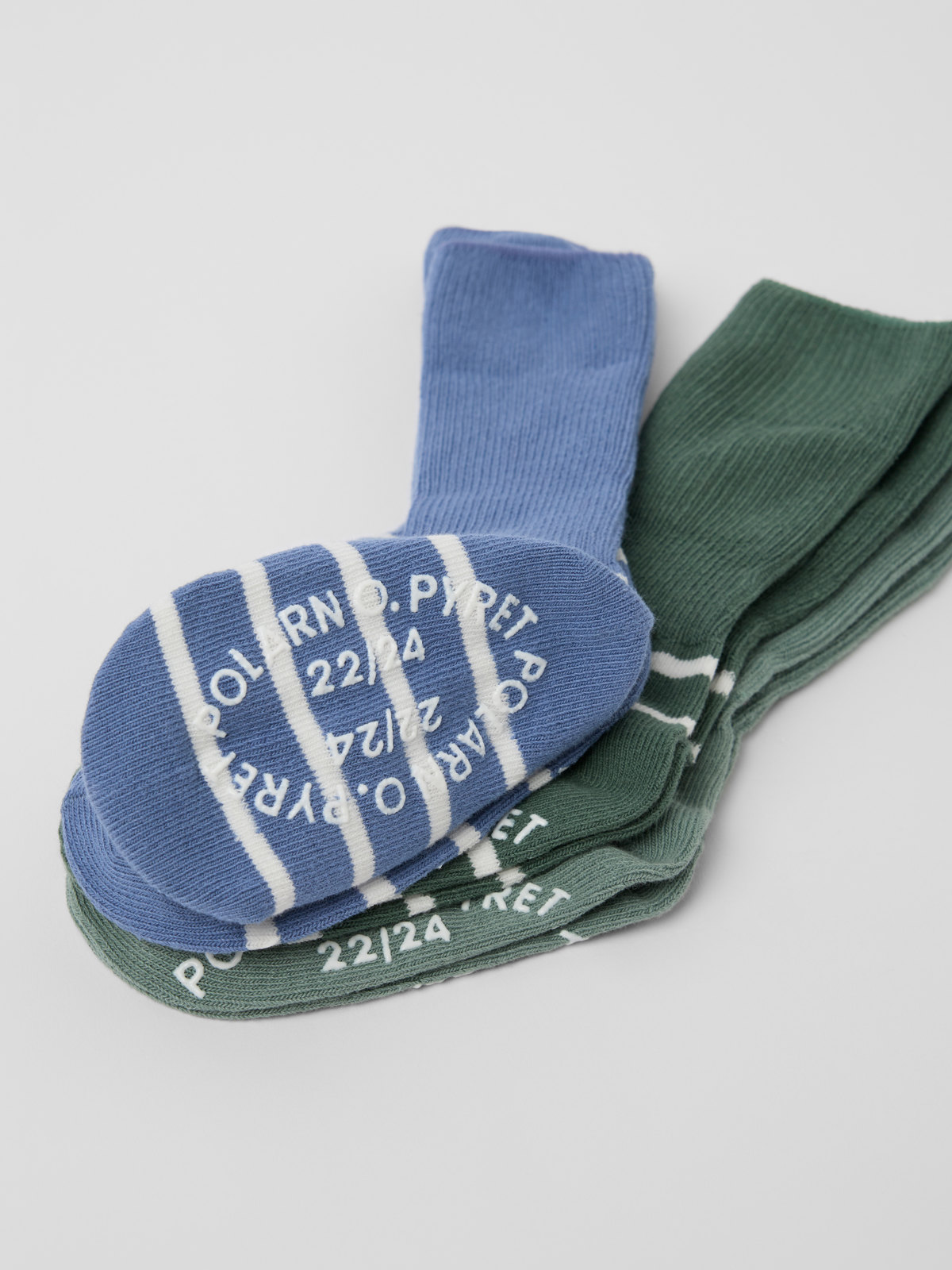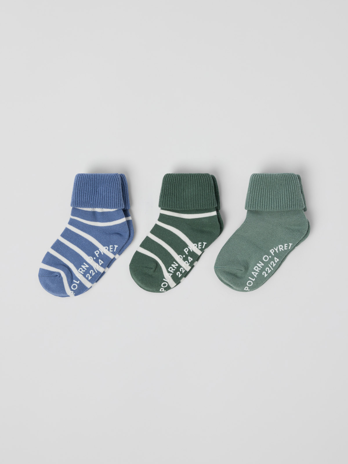Fyll på sokkeskuffen med en 3-pakning sokker med sklisikring. Sokkene er fremstilt i myk økologisk bomull og har en vrangbord som kan brettes opp eller ned.