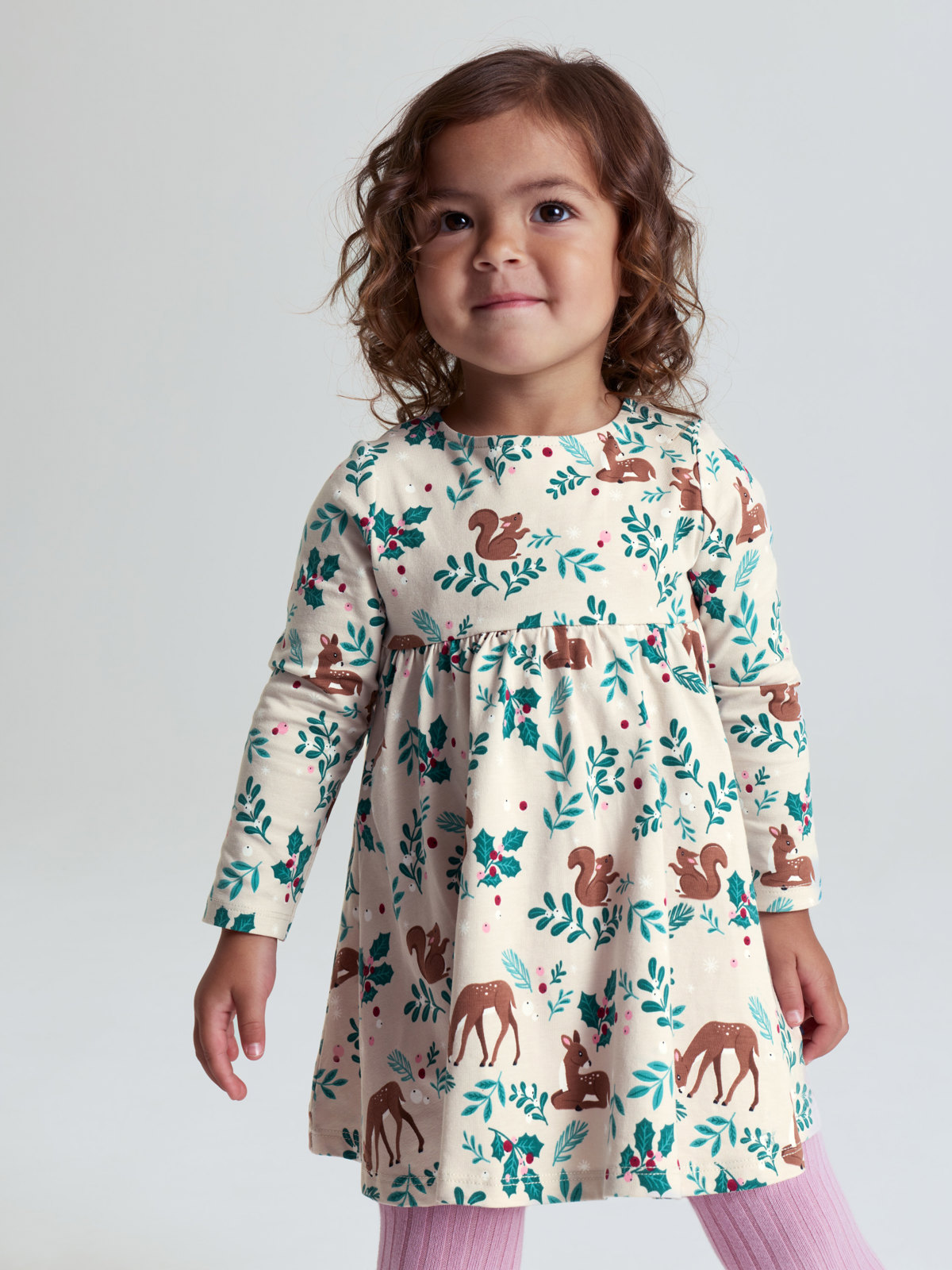I størrelsene 86–92 har kjolen høyere skjæring i midjen, og skjørtedelen er rynket.