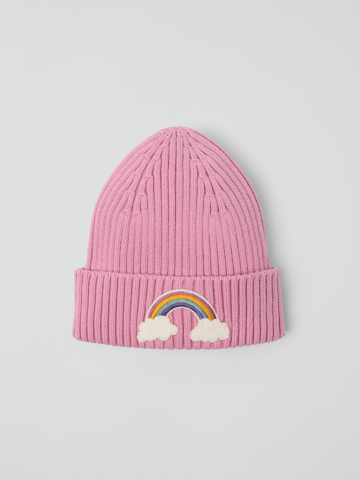 Ribbestrikket lue i økologisk bomull – perfekt til småkjølige høst- og vårdager. Luen har oppbrett nederst og en brodert applikasjon foran.