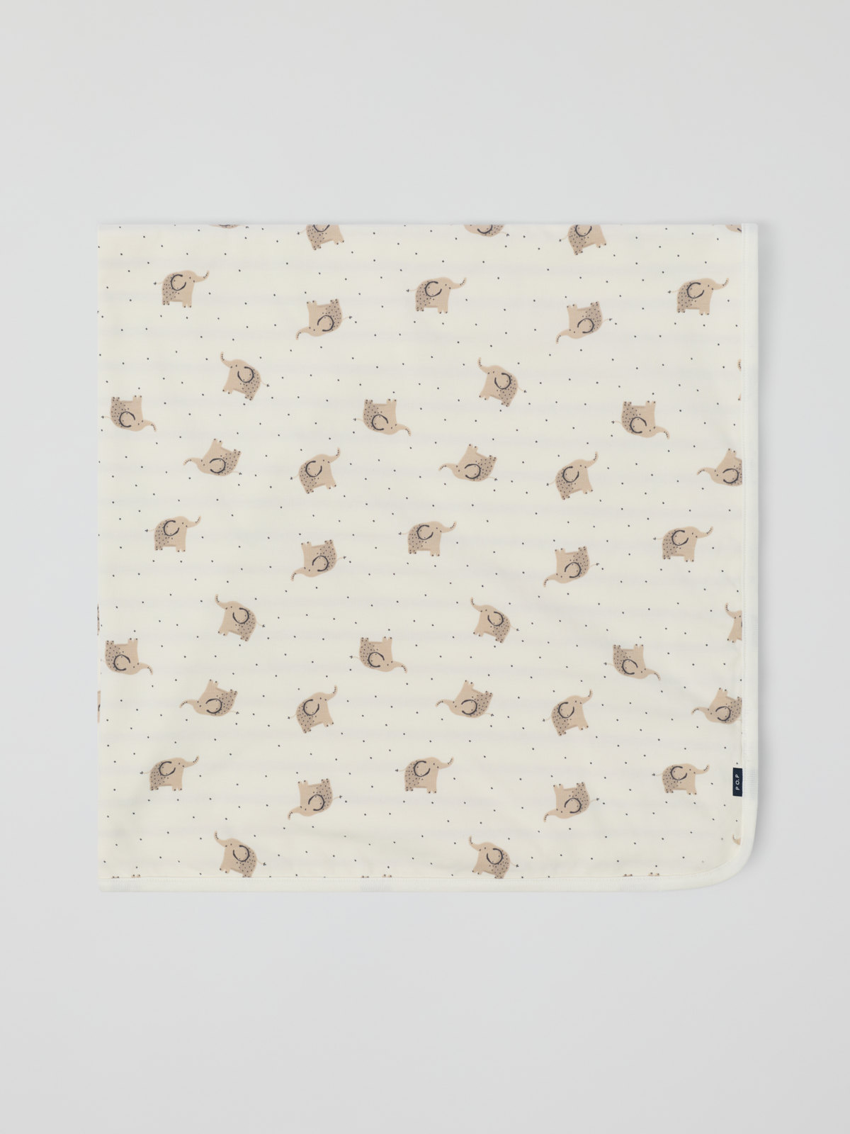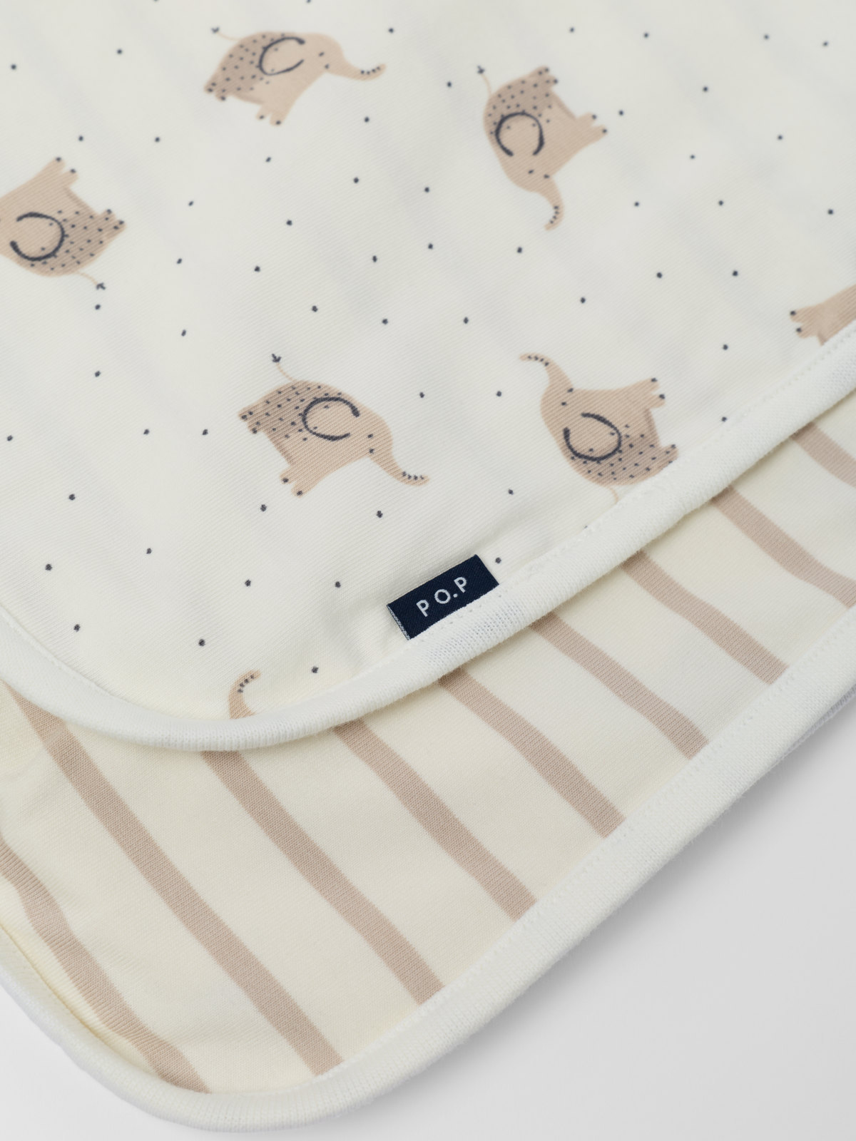 Mykt og behagelig babyteppe i økologisk bomull – perfekt til vognen eller hjemme. Teppet har små elefanter på den ene siden og vår klassiske stripe på den andre.