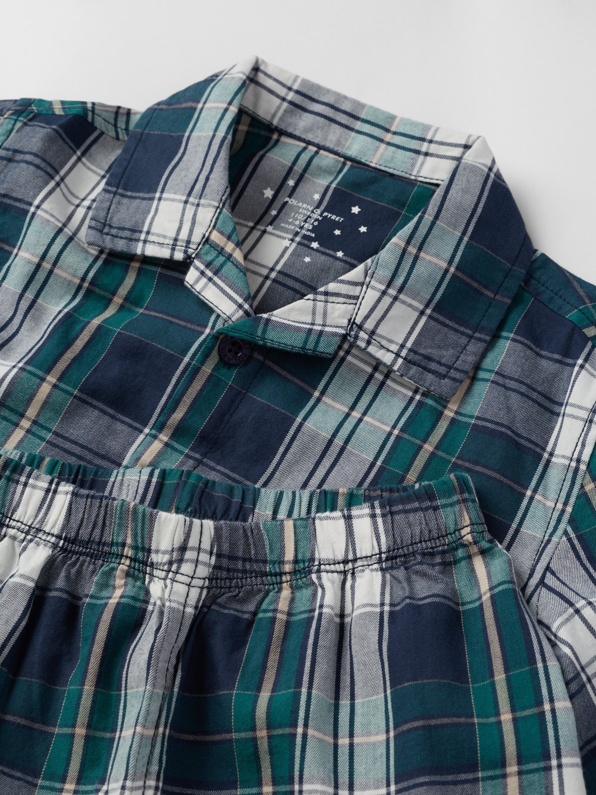 Rutet todelt pyjamas med klassisk skjorte og bukse i rett modell – match hele familien! Pyjamasen er fremstilt i lett børstet bomull og har elastisk midje.